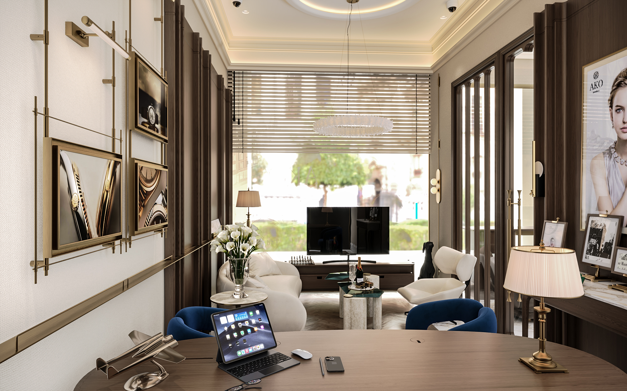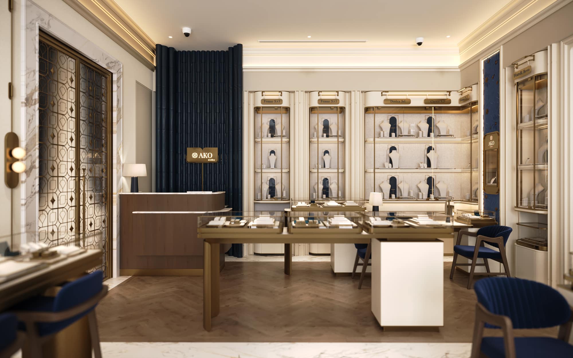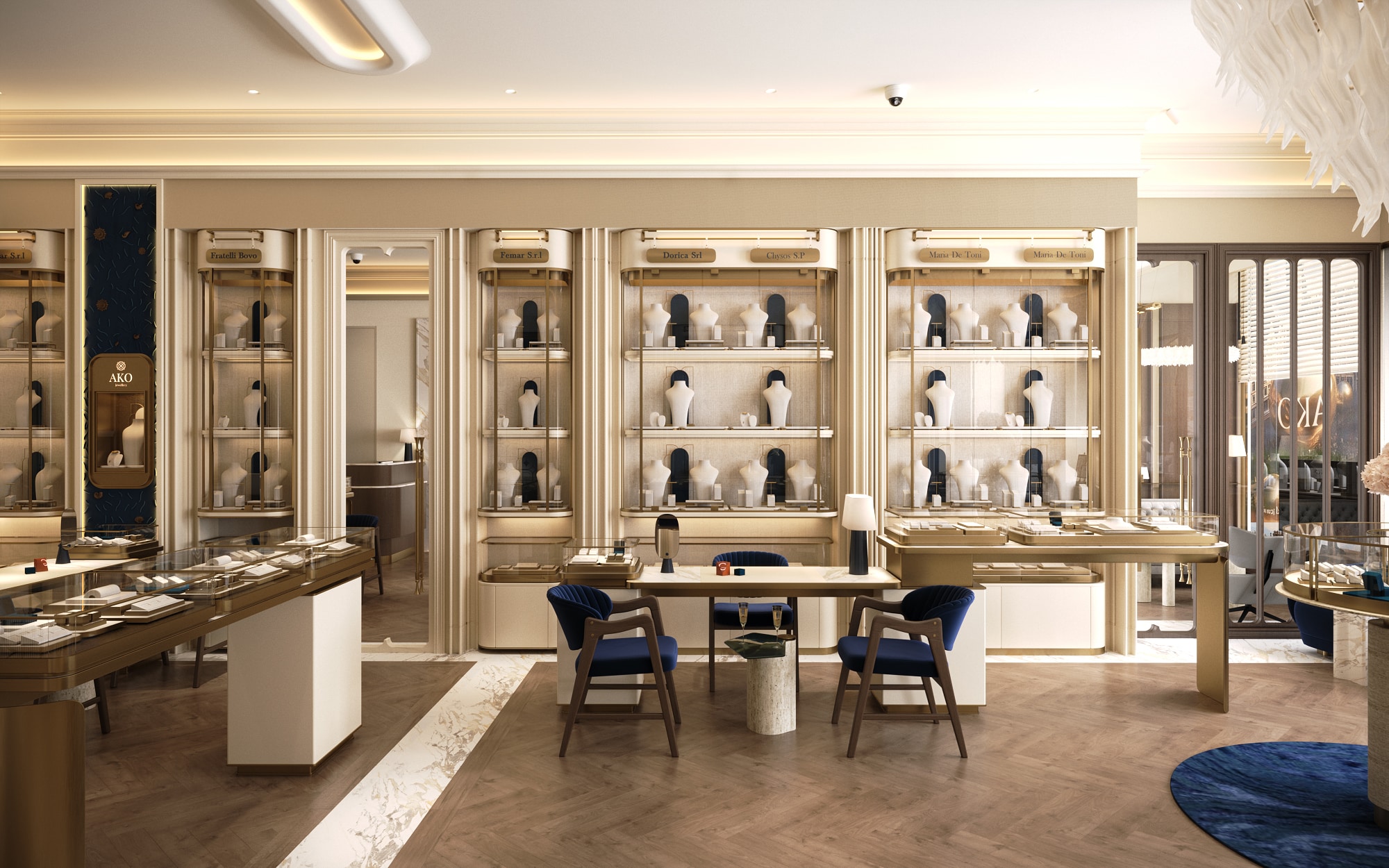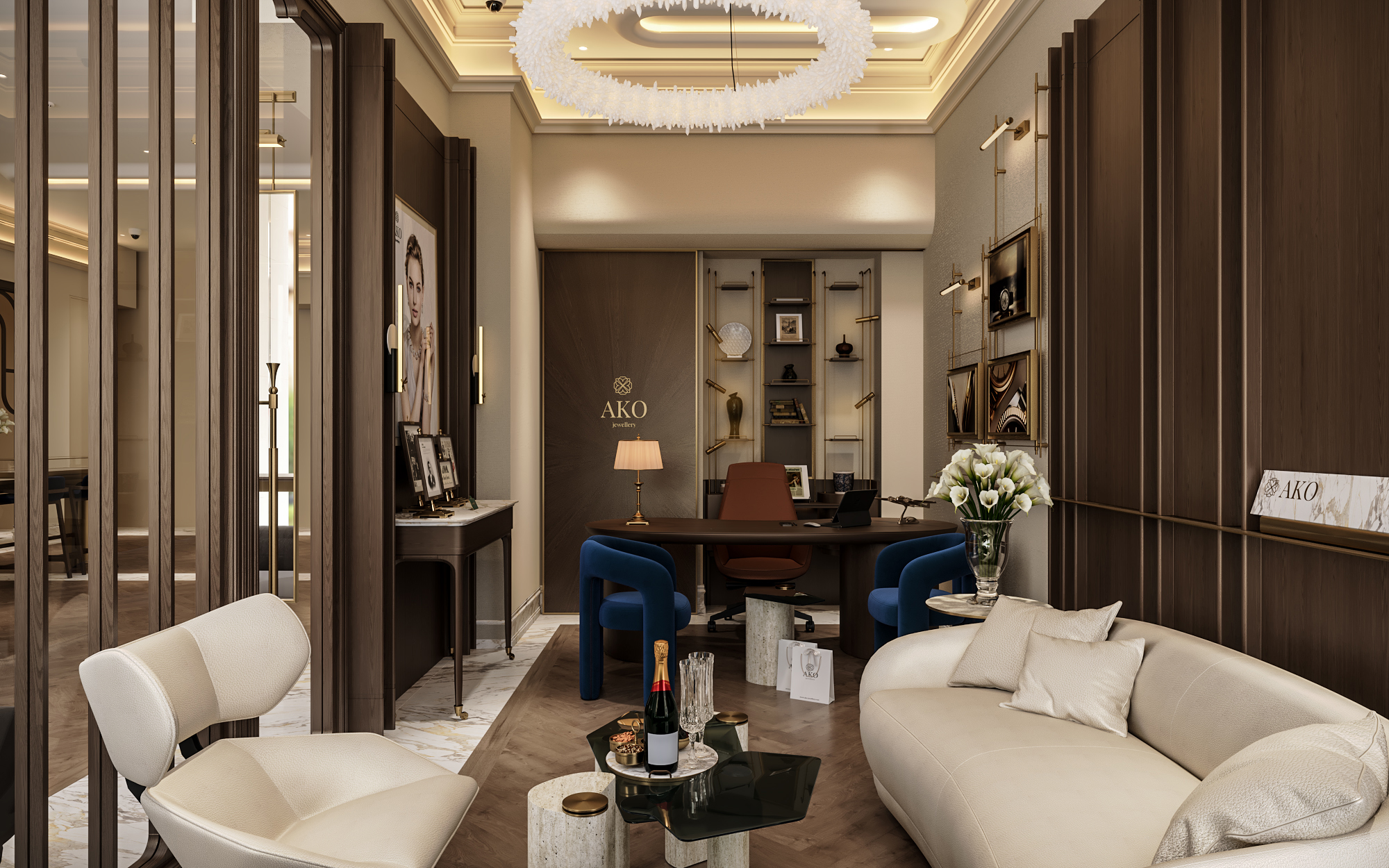 Mağazanın girişinde yer alan orta sergileme üniteleri ve totemler, tüm dikkatleri mücevherlerin üzerine çekiyor. Duvarlarda ise şıklığı tamamlayan duvar vitrinleri kusursuz bir bütünlük yaratıyor. Kasa bankosunun arkasındaki üç boyutlu ahşap panel, mekânın ihtişamını vurgularken, ofis bölümündeki ahşap paneller ve özel aydınlatmalar ise sıcak bir atmosfer sunuyor.