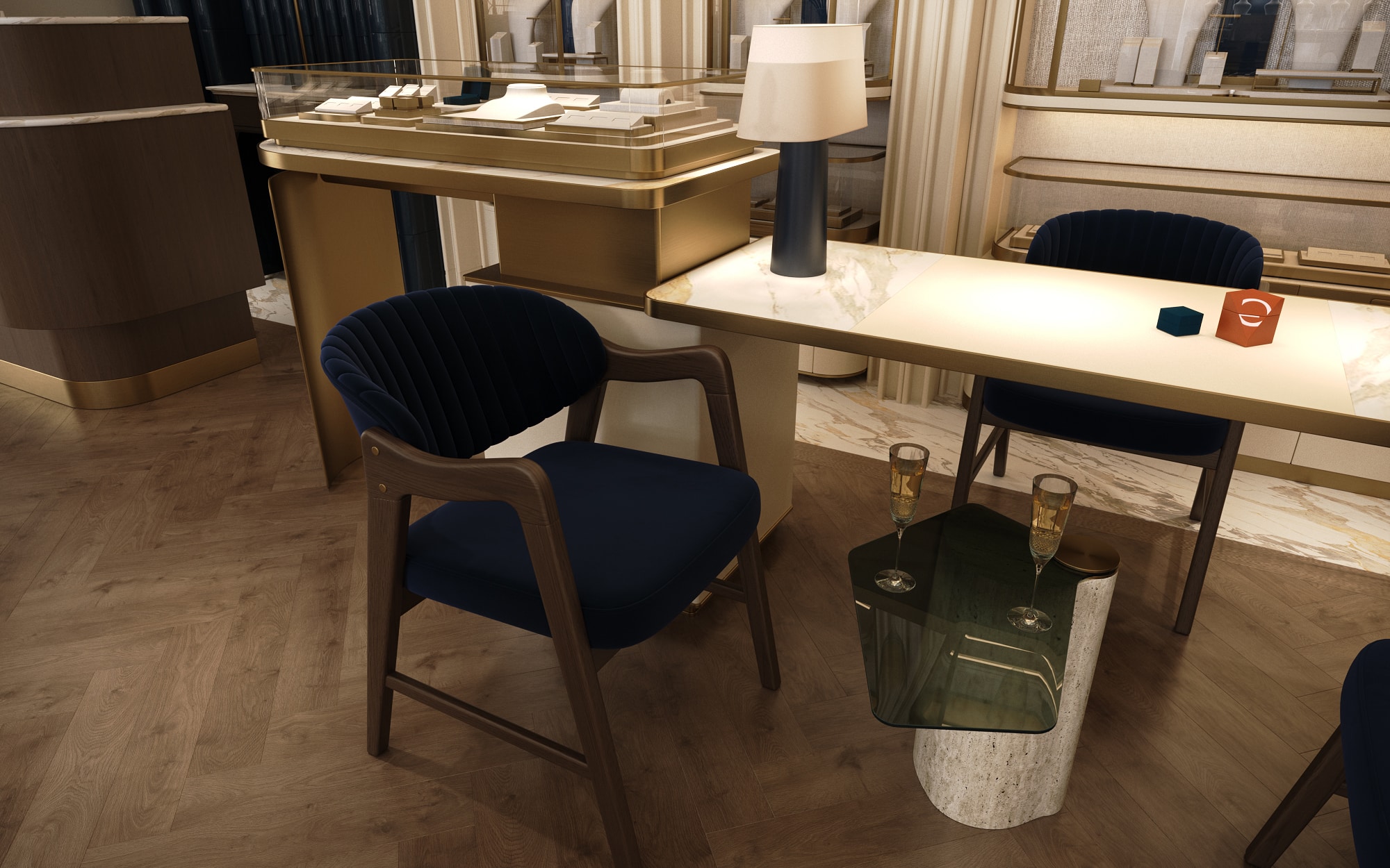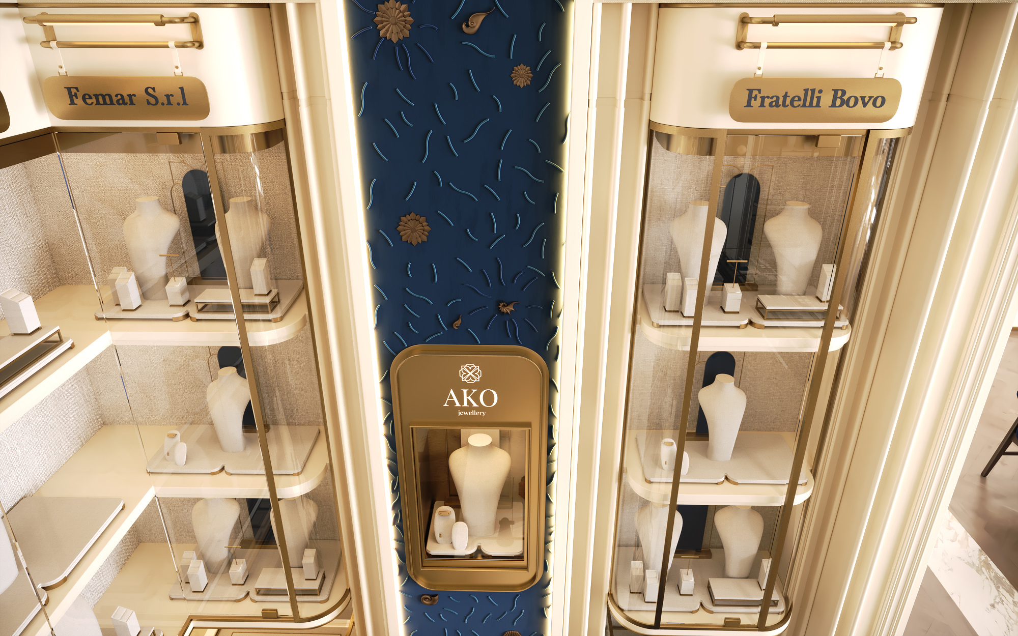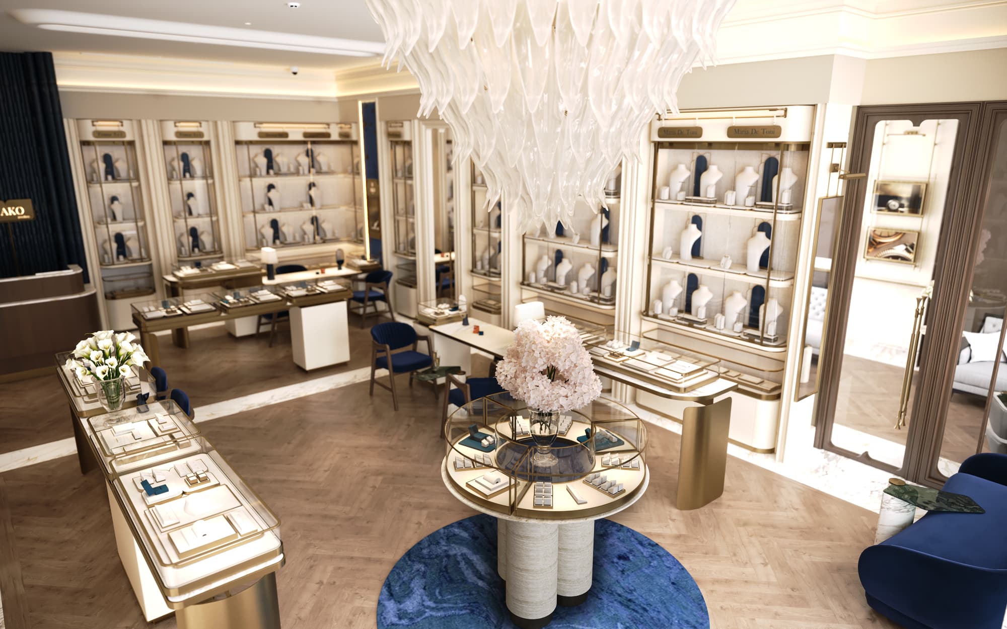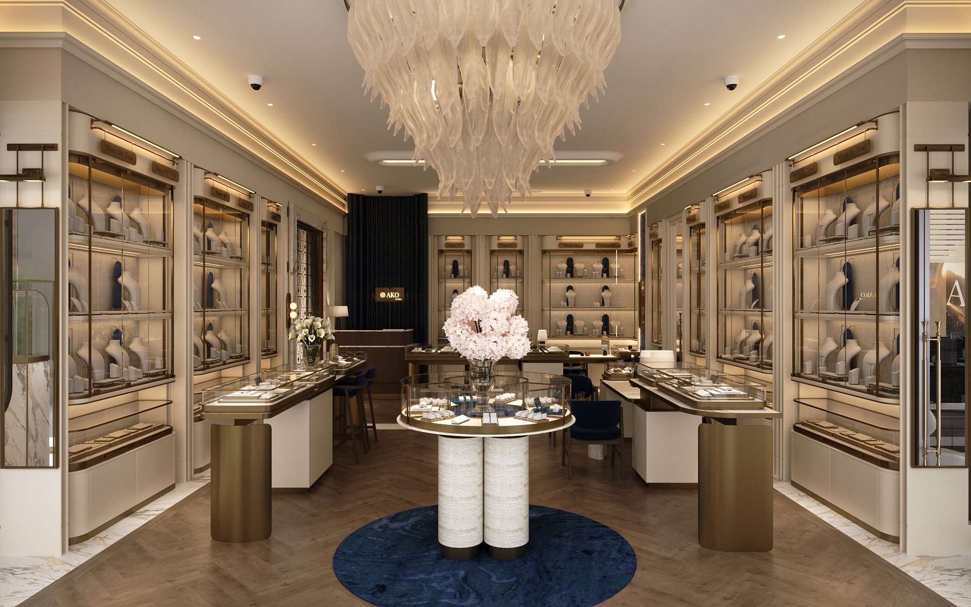 Mağazanın girişinde yer alan orta sergileme üniteleri ve totemler, tüm dikkatleri mücevherlerin üzerine çekiyor. Duvarlarda ise şıklığı tamamlayan duvar vitrinleri kusursuz bir bütünlük yaratıyor. Kasa bankosunun arkasındaki üç boyutlu ahşap panel, mekânın ihtişamını vurgularken, ofis bölümündeki ahşap paneller ve özel aydınlatmalar ise sıcak bir atmosfer sunuyor.