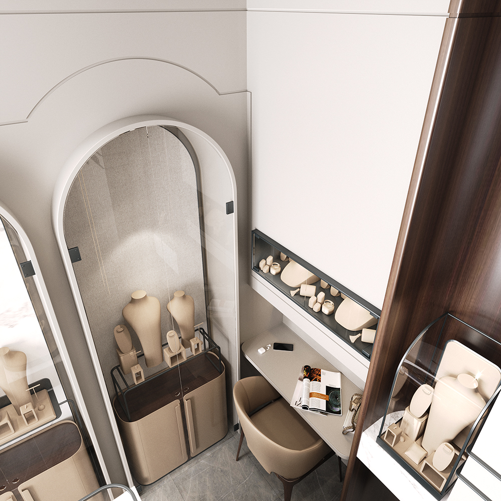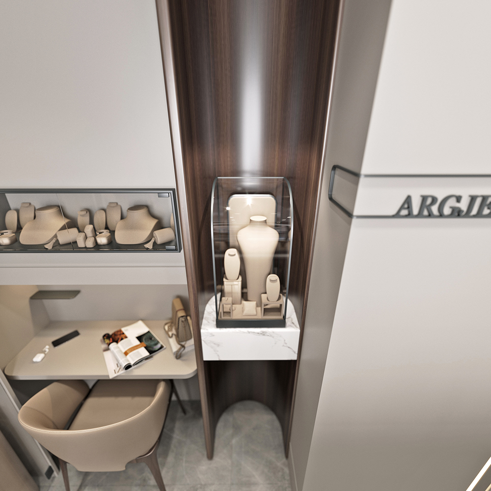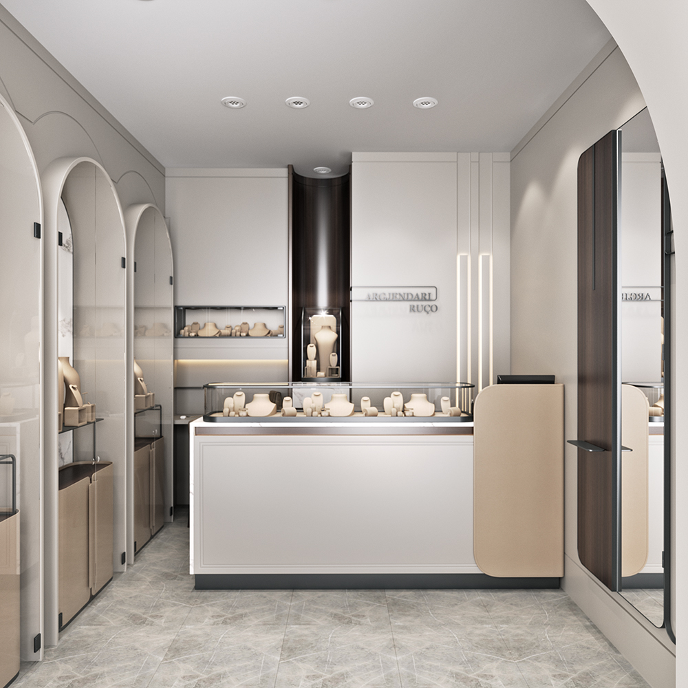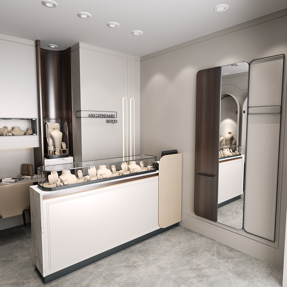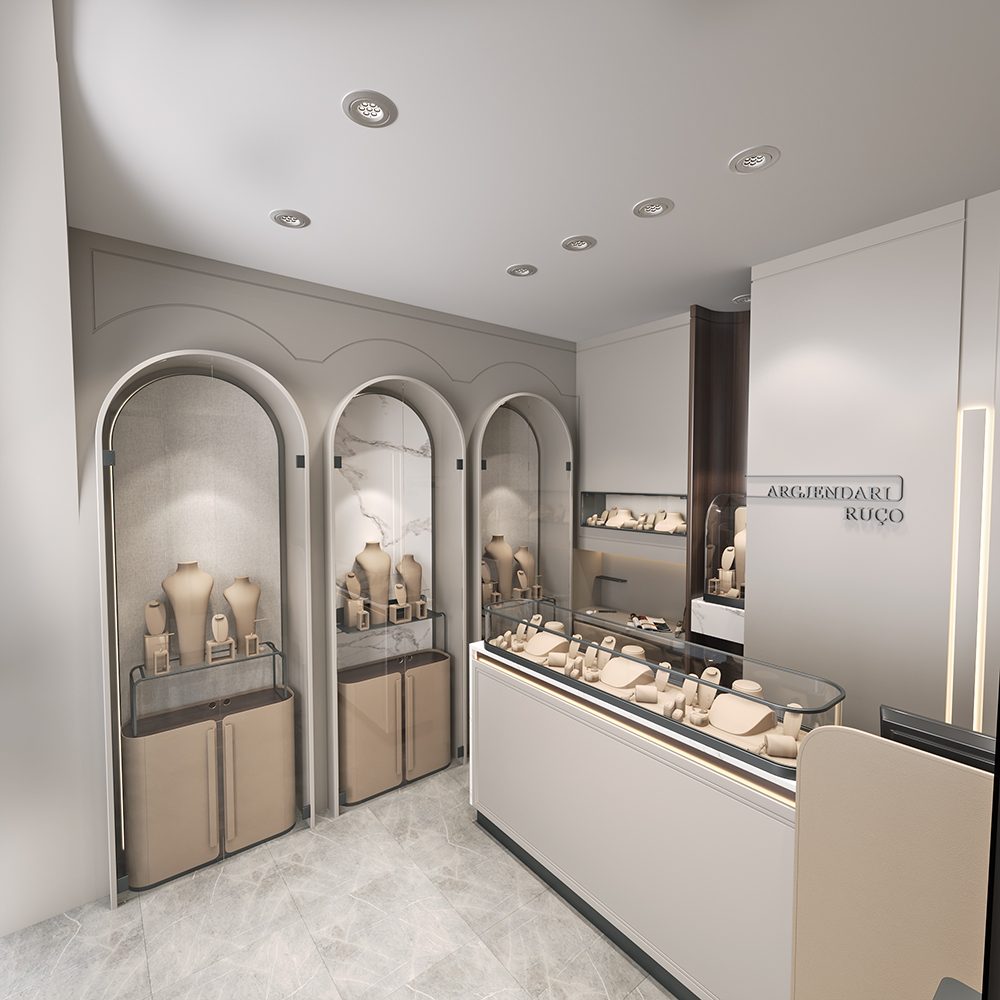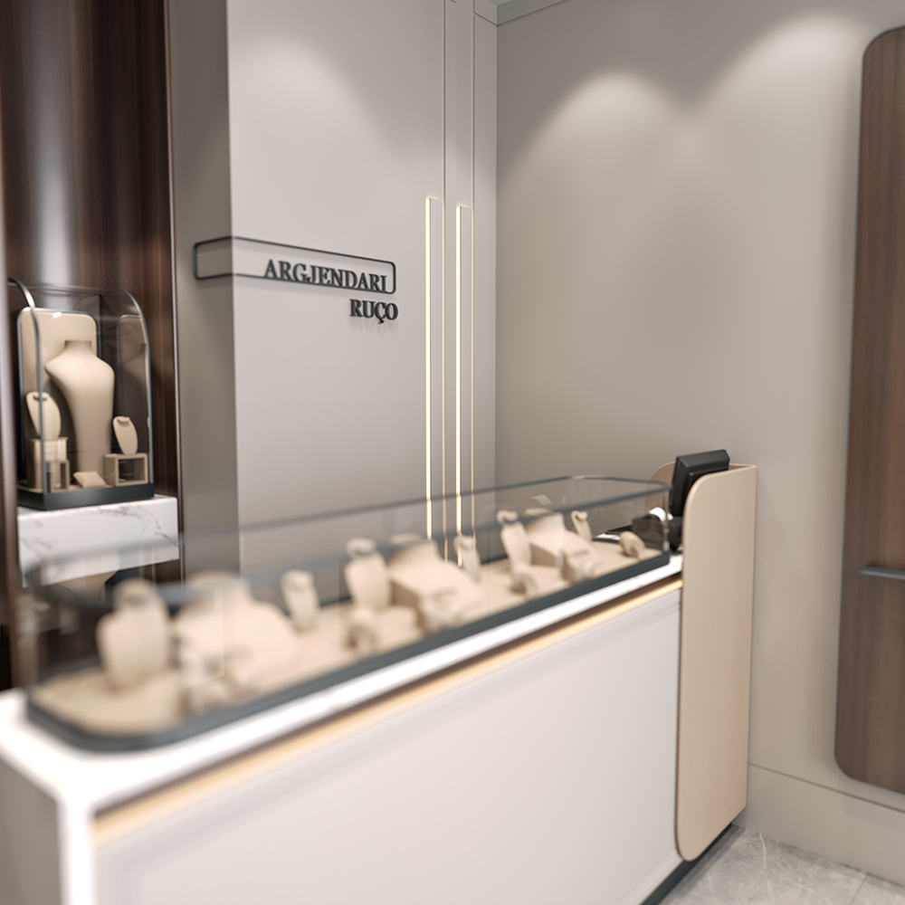 9 m² lik bir alana sahip olan kuyumcu konsept projesi Arnavutluk için hazırlandı. Kuyumcunun tasarımında sade renk ve doku seçimleriyle minimal bir konsept oluşturuldu.