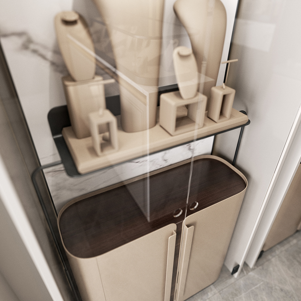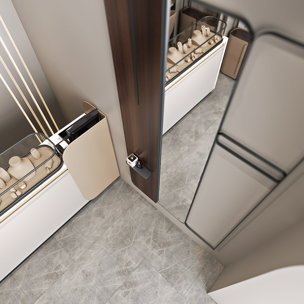 Kısıtlı bir alana sahip olan kuyumcunun dekorasyonunda fonksiyonellik de göz önünde bulundurularak duvar üniteleri içerisinde depolama alanları tasarlandı.