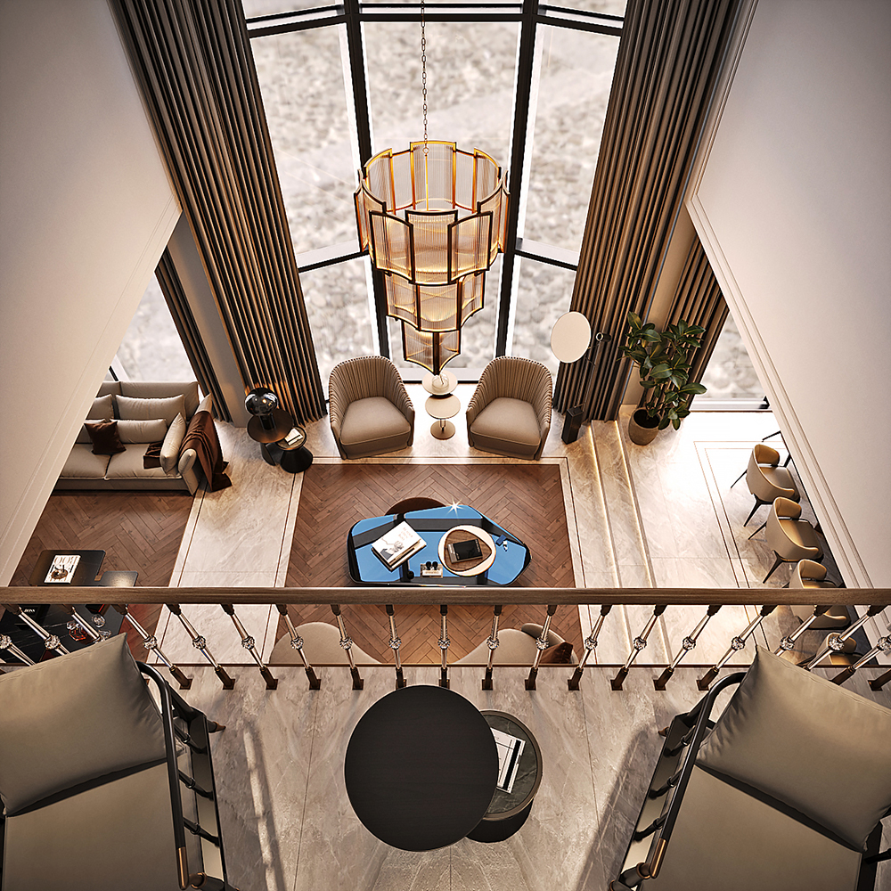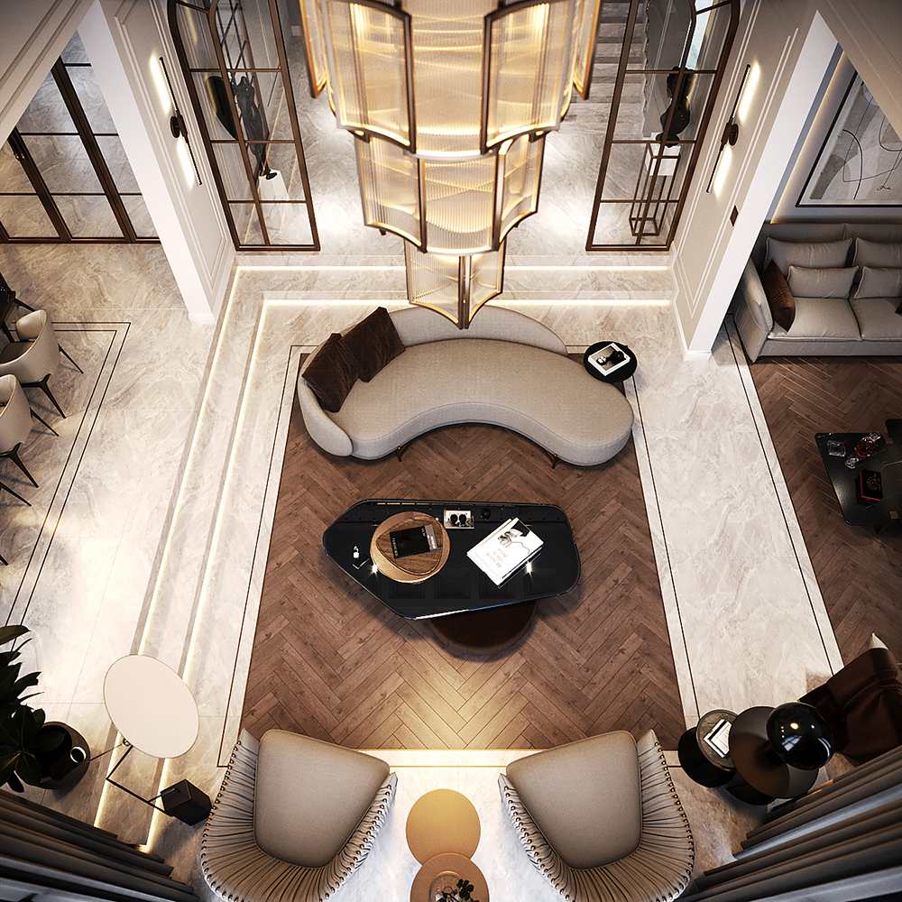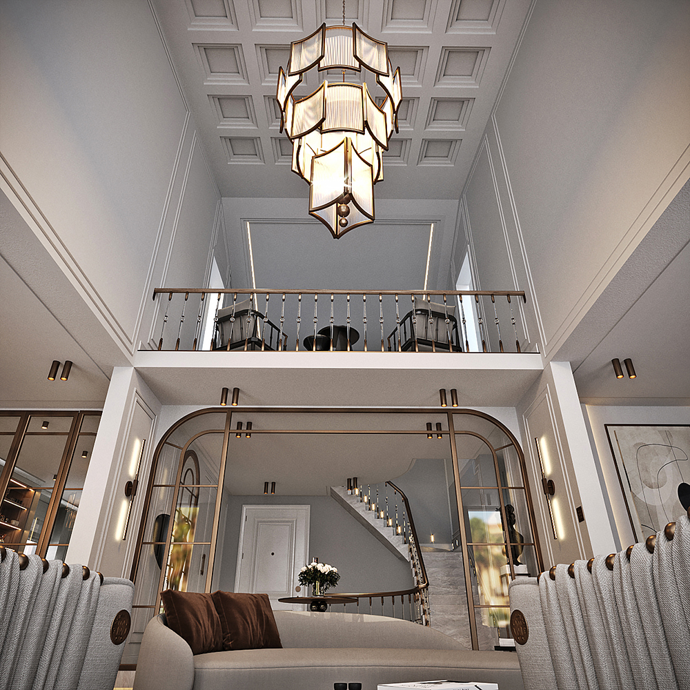 Lüks konutun tasarımında galeri boşluğu ve giriş holü için kullanılan özel aydınlatmalar ve mobilyalar sayesinde modern tasarımın ruhu evin her alanında yansıltıdı.