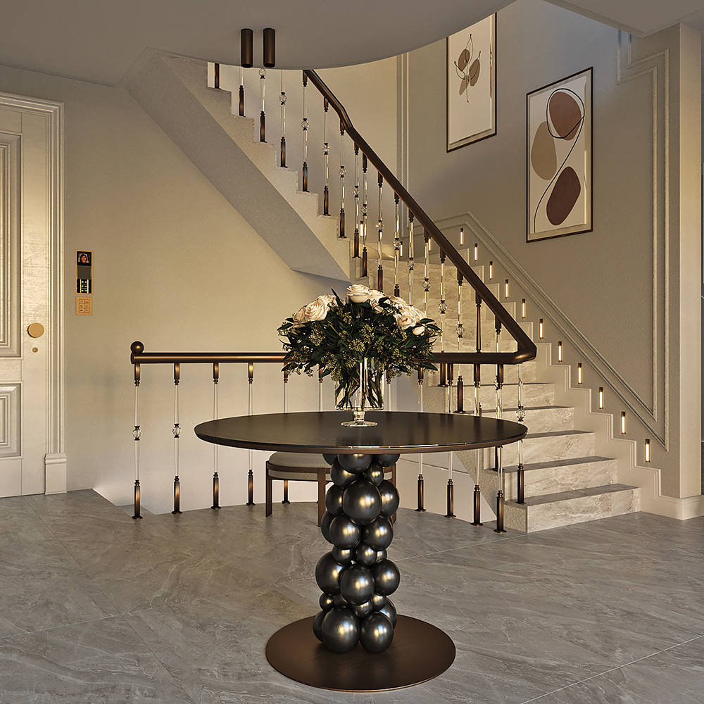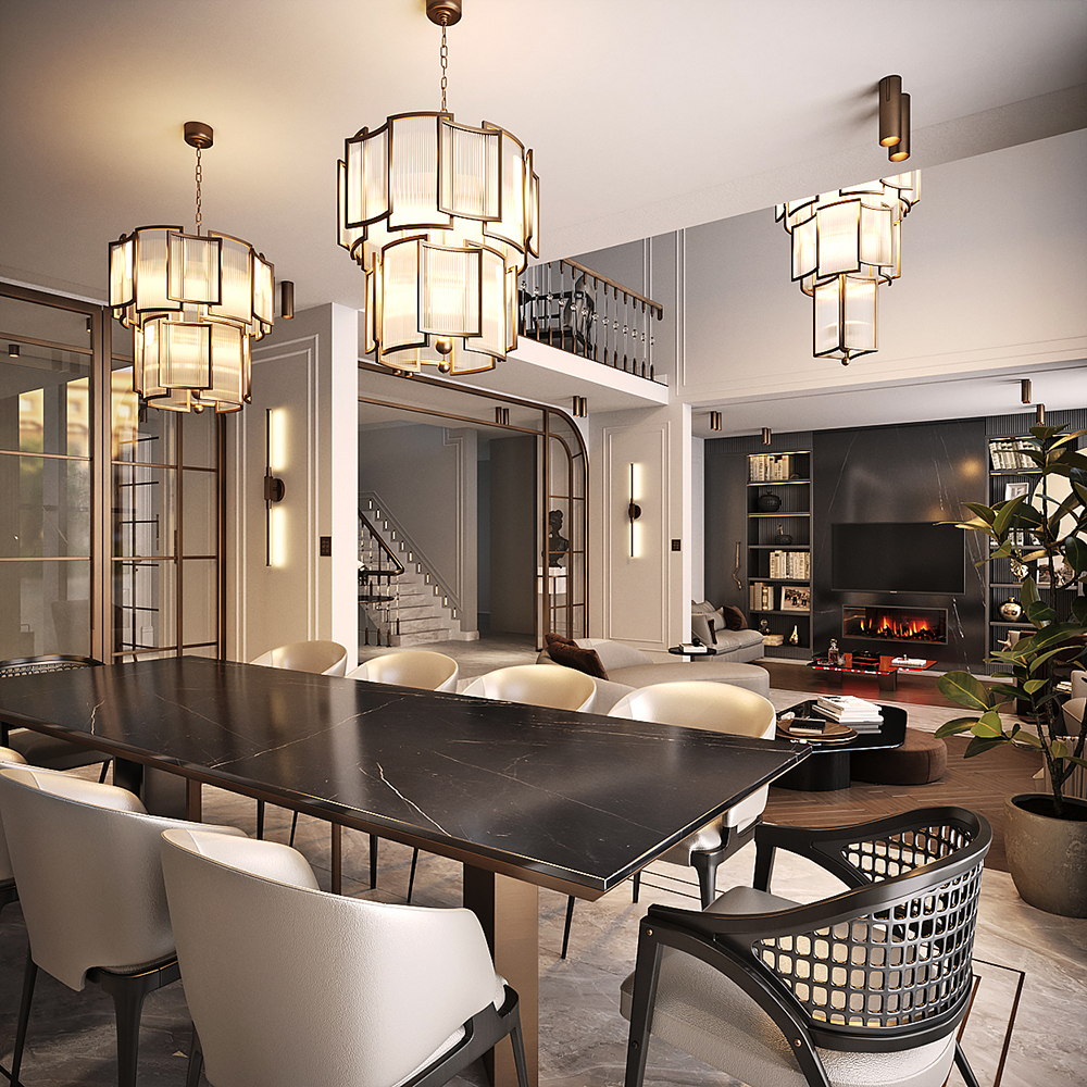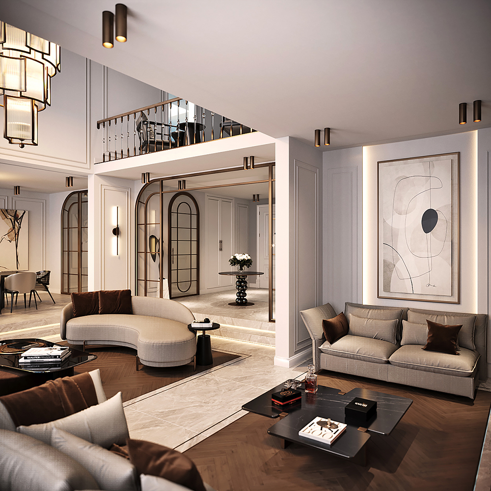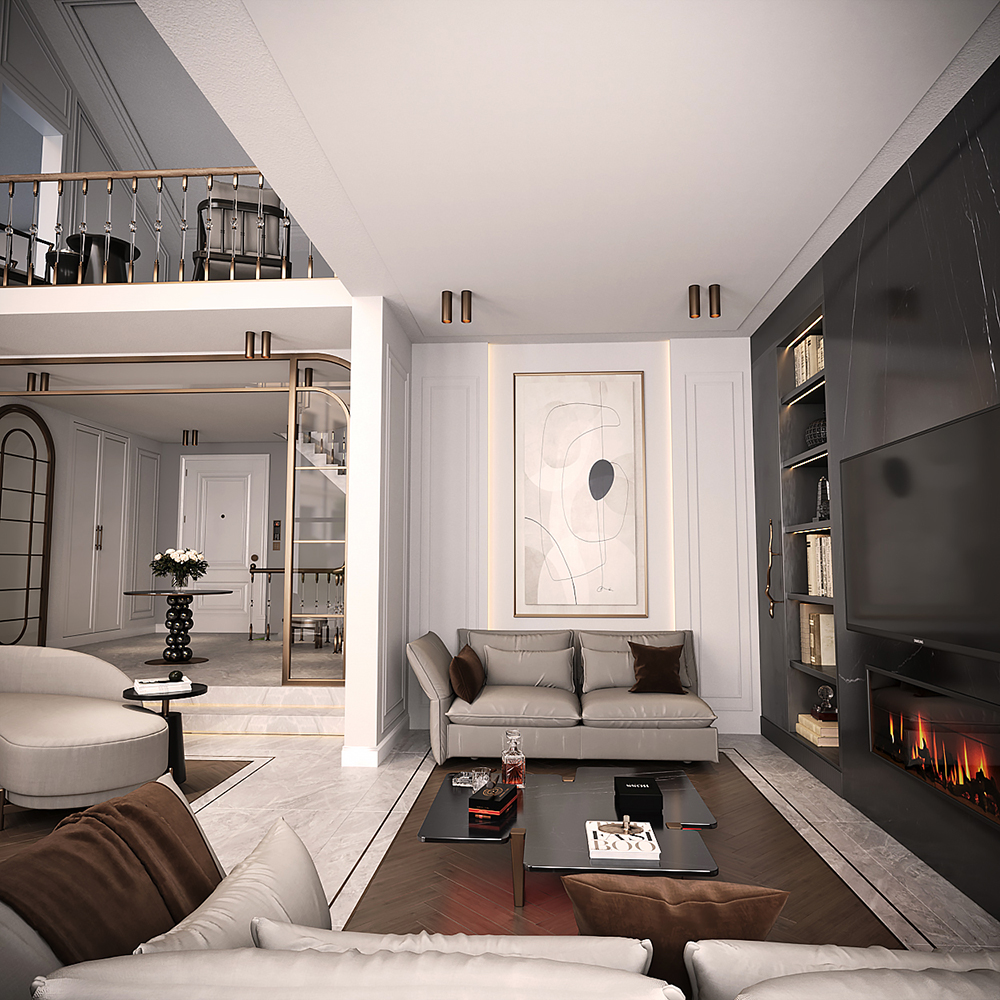 Lüks konutun tasarımında galeri boşluğu ve giriş holü için kullanılan özel aydınlatmalar ve mobilyalar sayesinde modern tasarımın ruhu evin her alanında yansıltıdı.