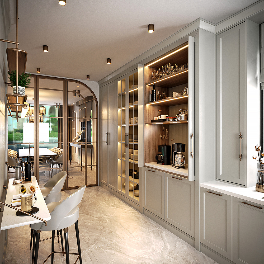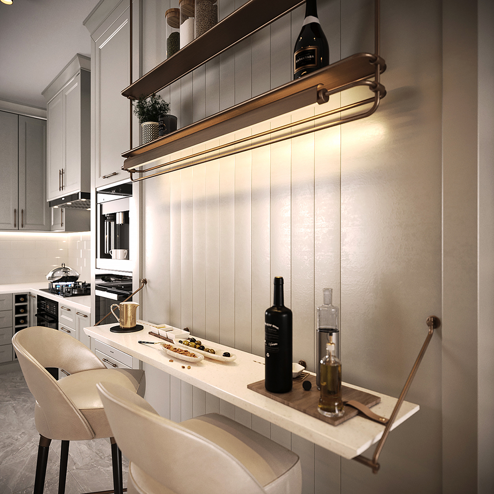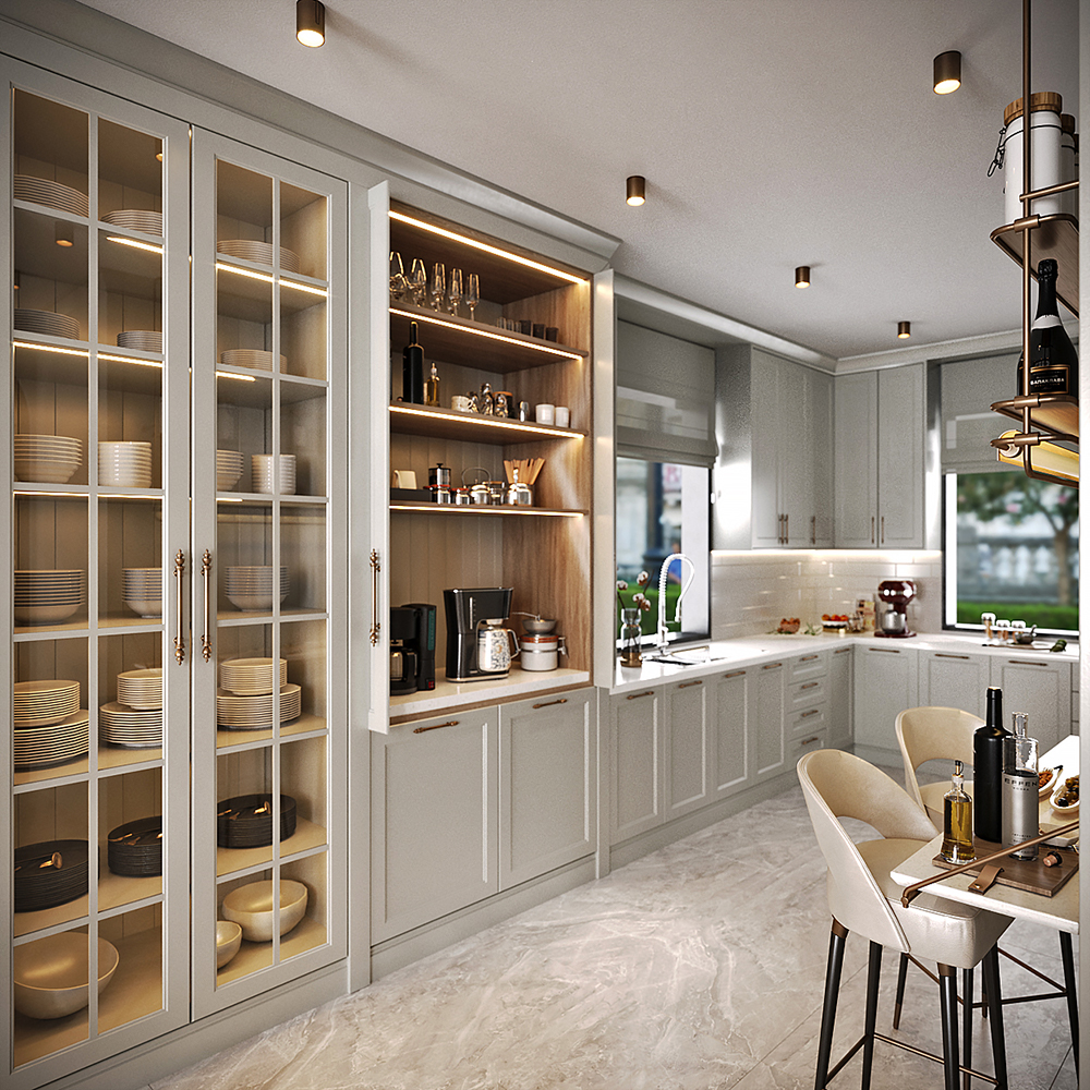 Mutfakta açık renk lake dolaplar kullanarak fresh bir mekan oluşturuldu. Kahve köşesi özel mekanizmalı bir kapak sistemi ile tasarlandı. Bu köşenin iç detaylarında koyu renk ahşap kullanarak kontrast sağlandı. Cam kapak detaylı dolaplar ve pirinç detaylı oturma alanı ile mutfak tasarımı farklılaştırıldı.