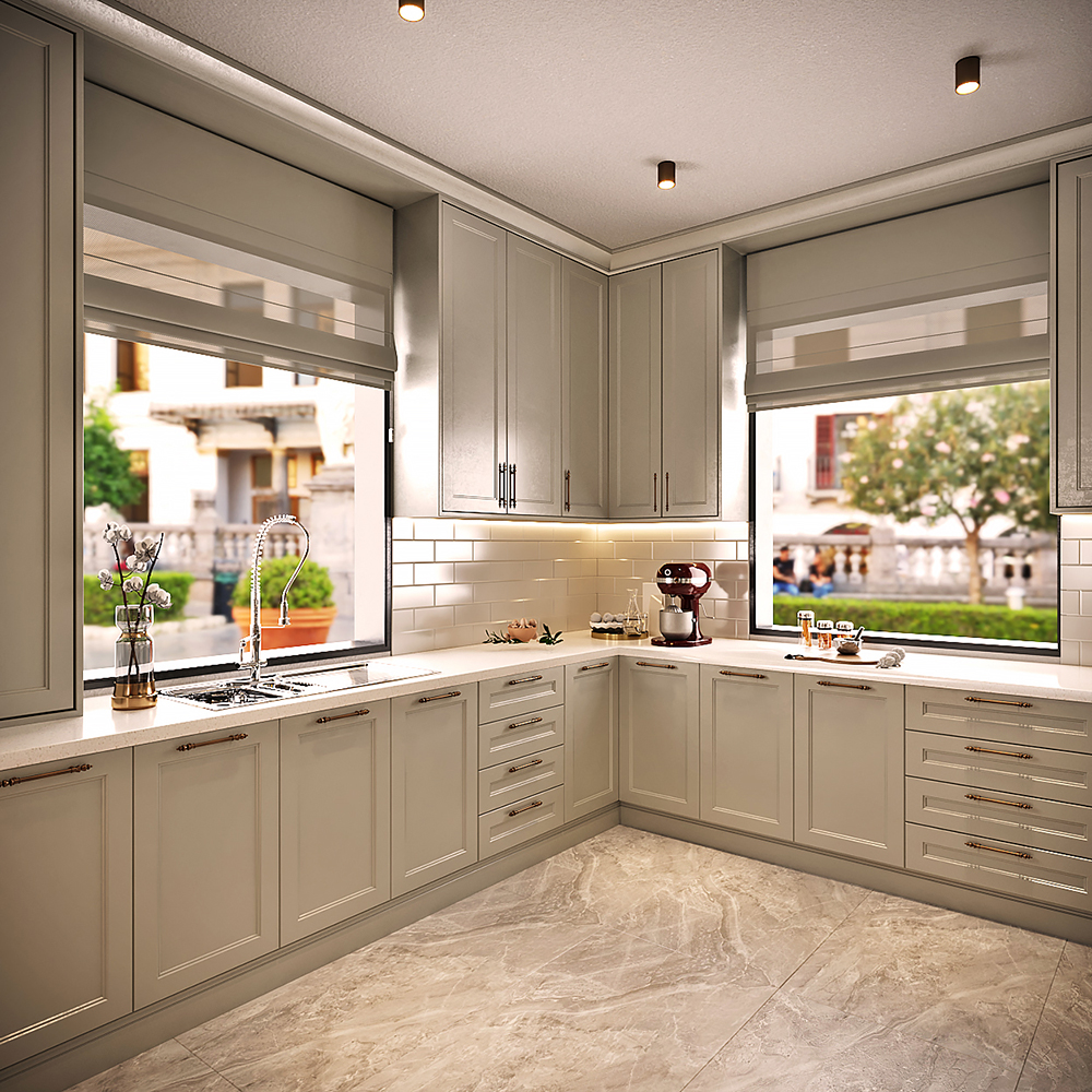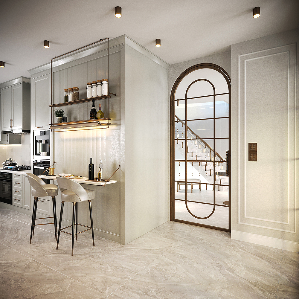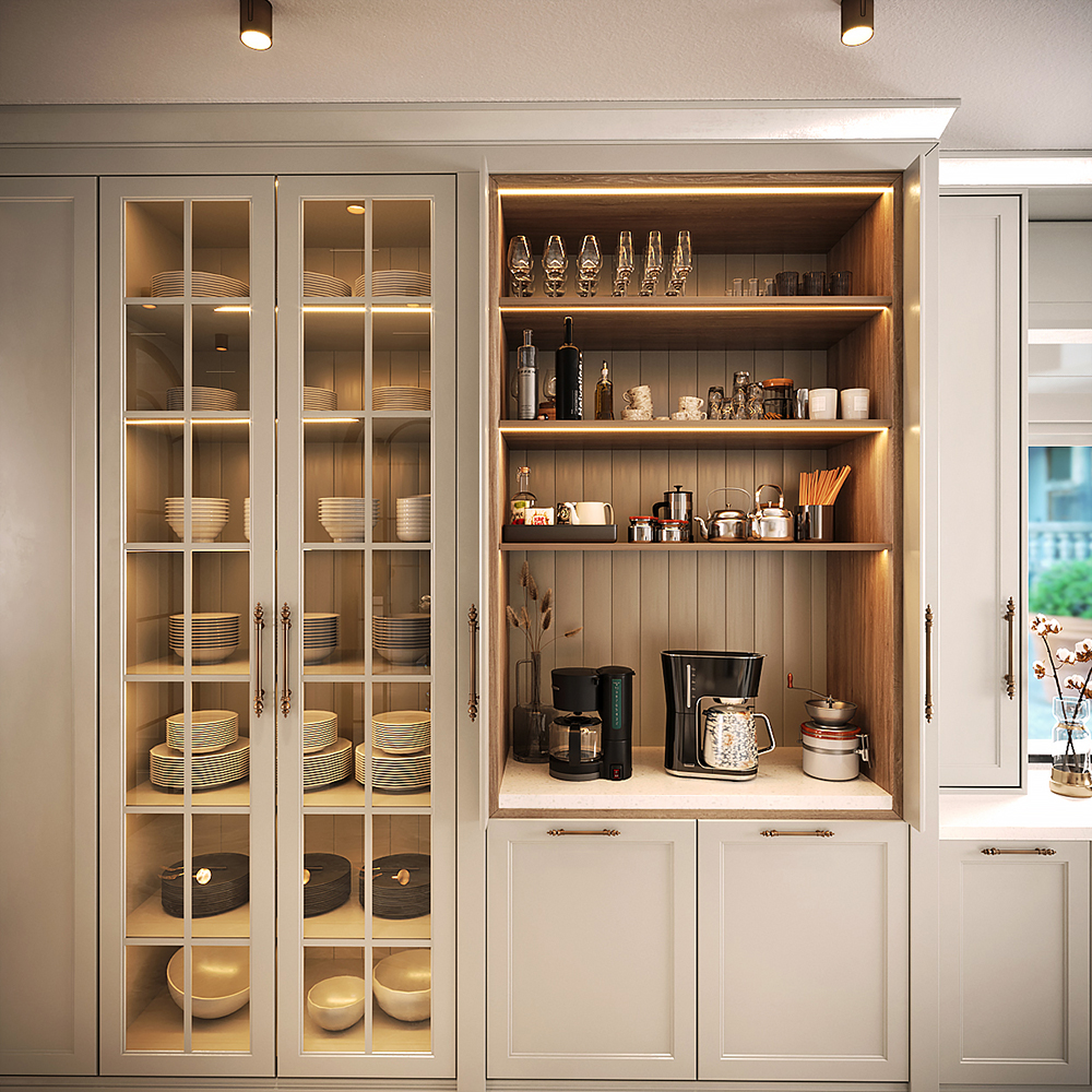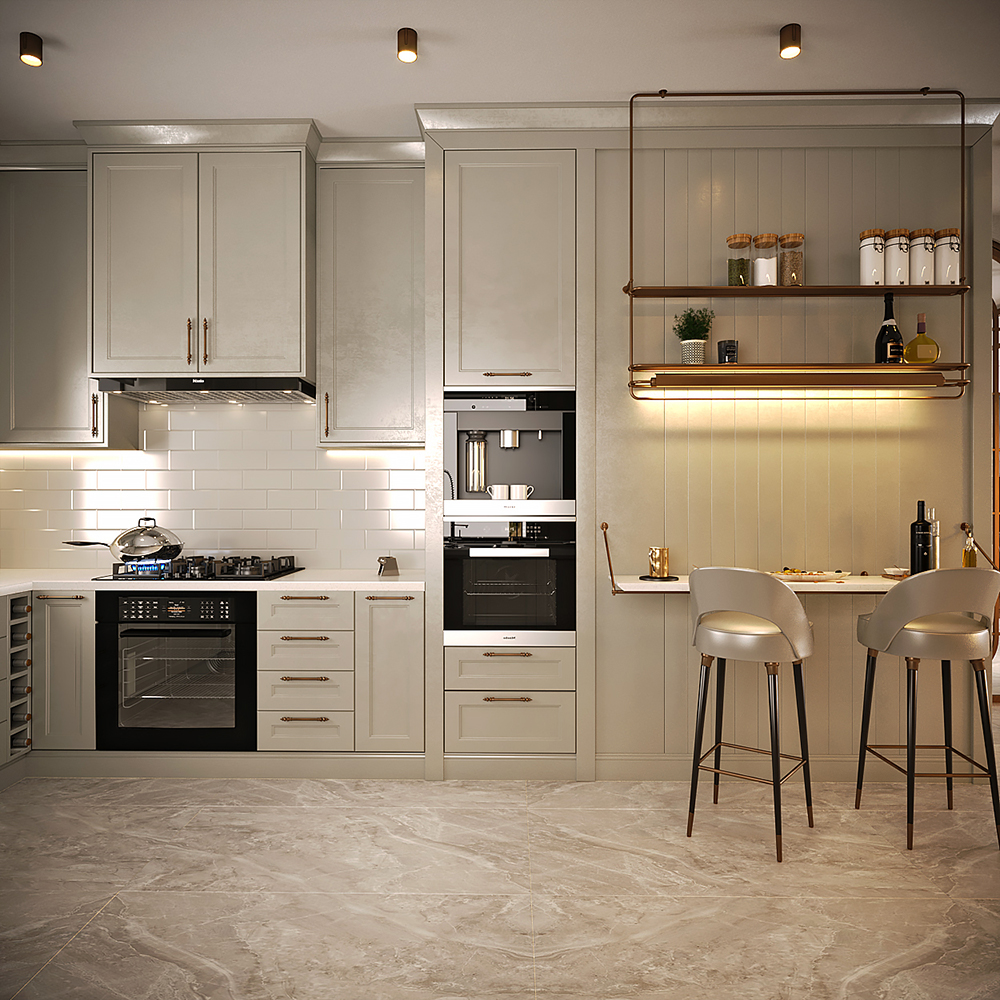 Mutfakta açık renk lake dolaplar kullanarak fresh bir mekan oluşturuldu. Kahve köşesi özel mekanizmalı bir kapak sistemi ile tasarlandı. Bu köşenin iç detaylarında koyu renk ahşap kullanarak kontrast sağlandı. Cam kapak detaylı dolaplar ve pirinç detaylı oturma alanı ile mutfak tasarımı farklılaştırıldı.
