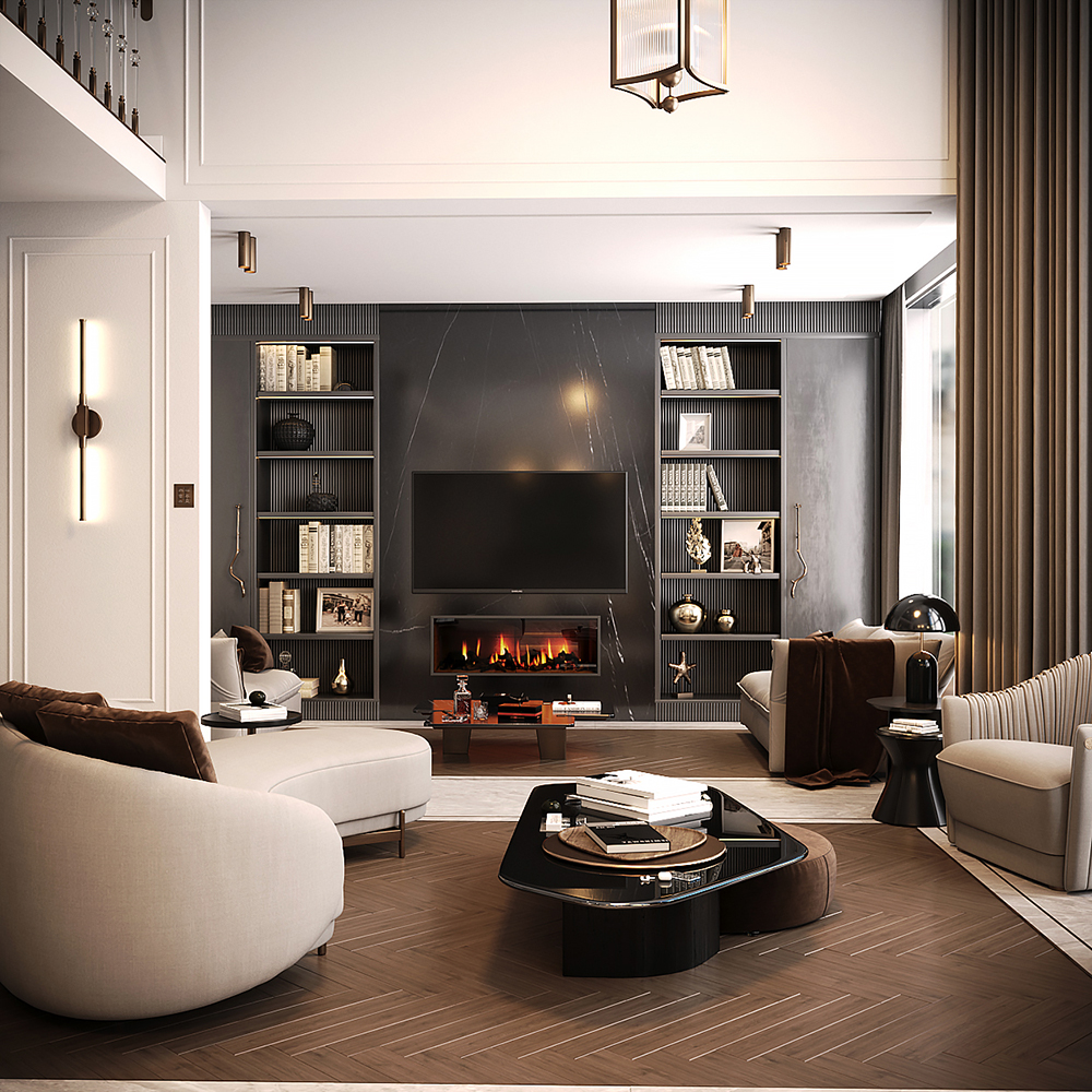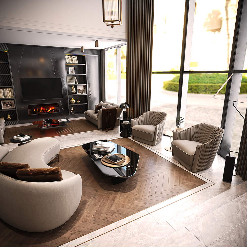 Zemin döşemesinde mermer ve balıksırtı ahşap parkenin doğal uyumu, duvarda ise lake ahşap çıtaların sadeliği kullanılmıştır. Malzemelerde özel detaylar kullanarak konutun 3D tasarımı ve dekorasyonu zenginleştirilmiştir.