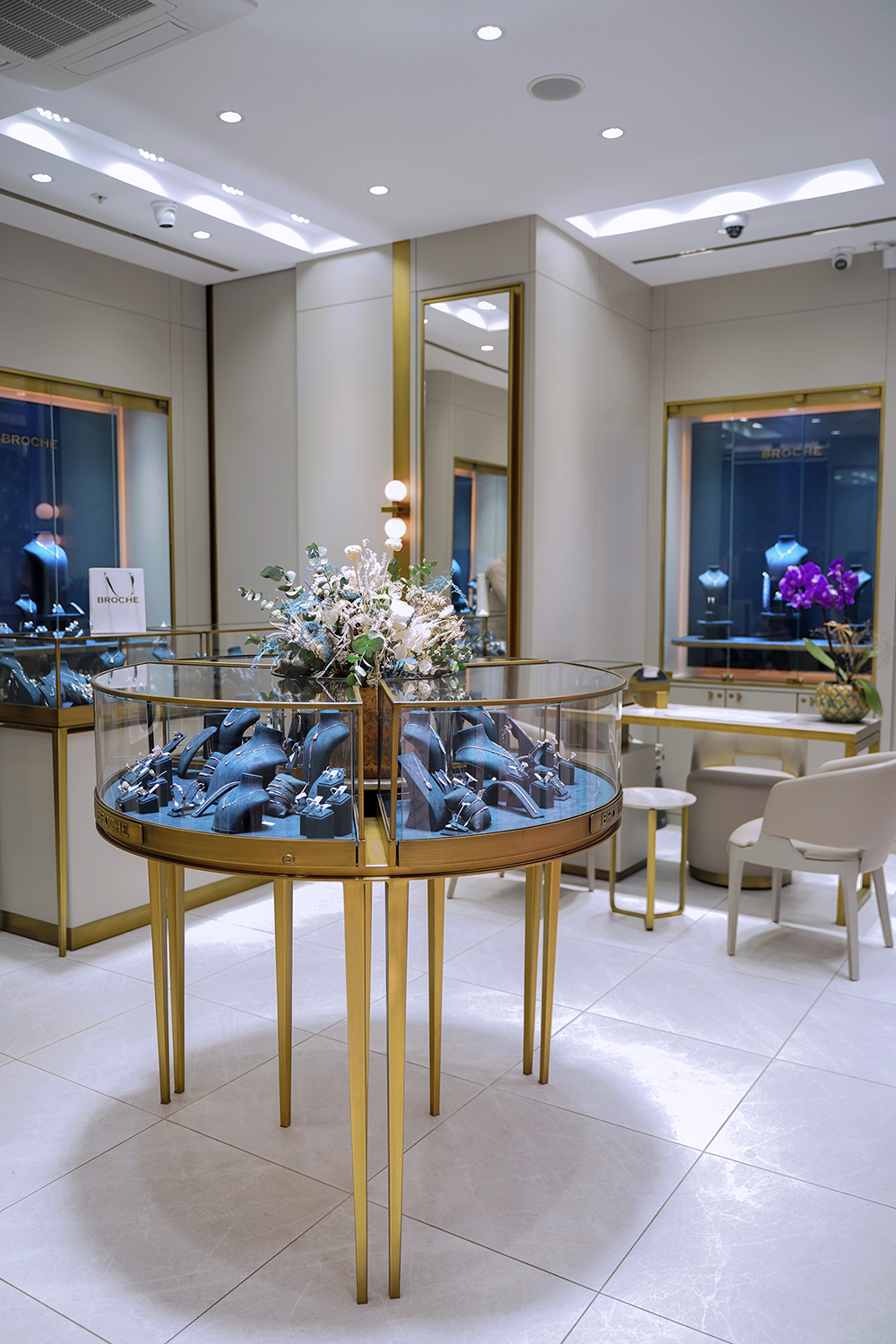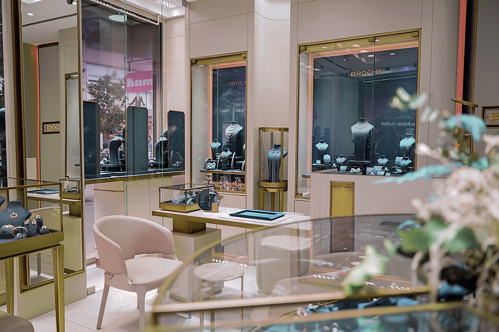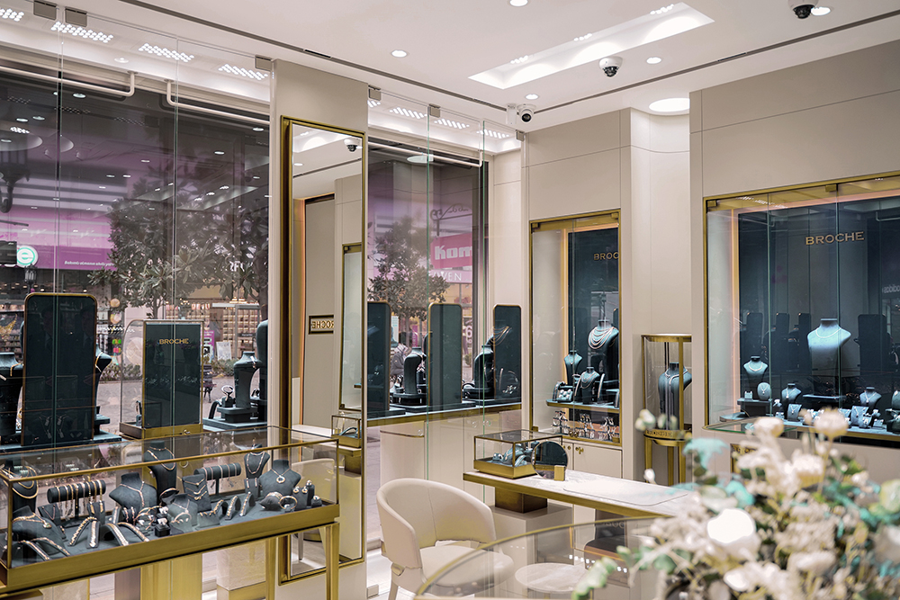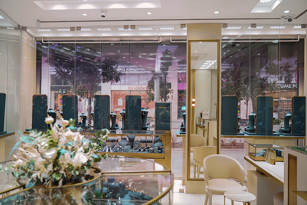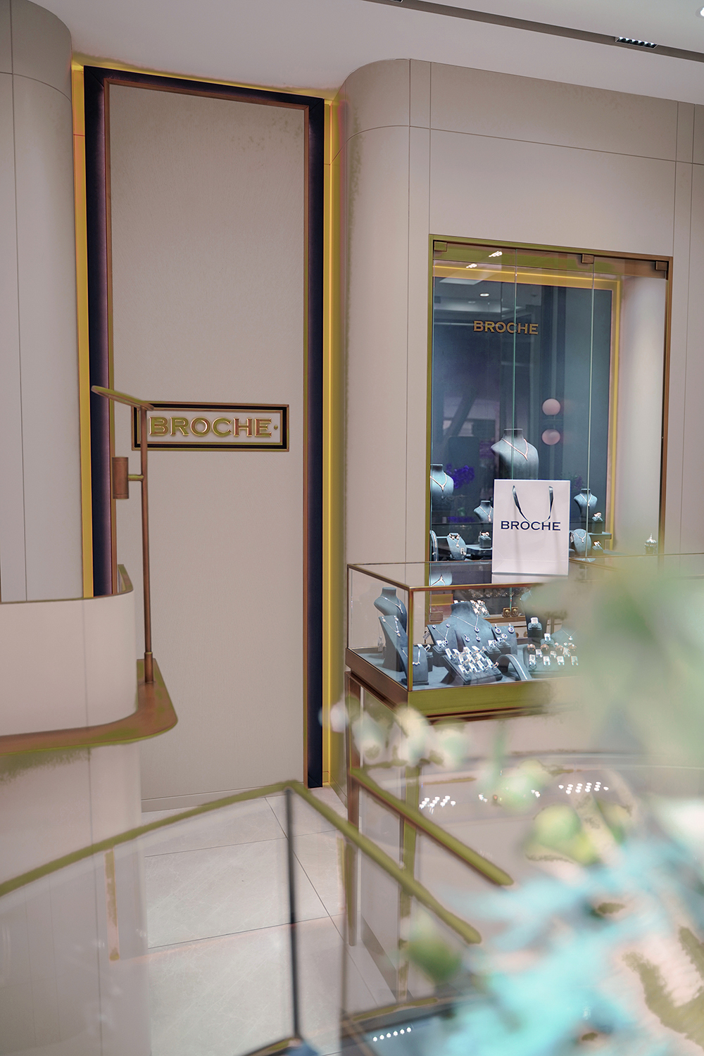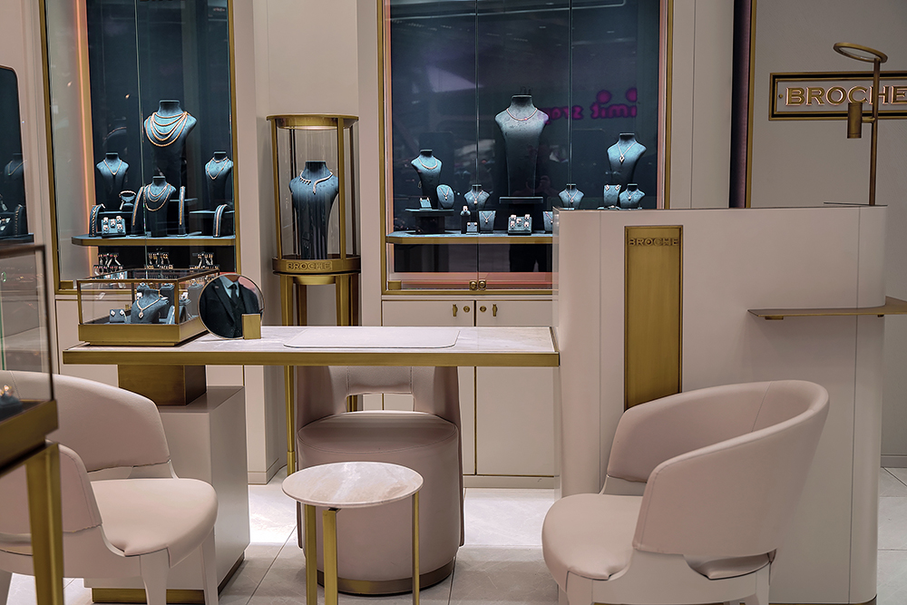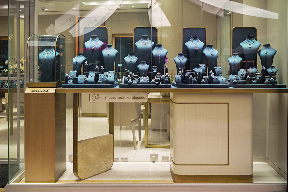 Lüks mücevher mağazasının dekorasyonunda konsept renklerinin uyumuna özen gösterildi. Duvar ünitelerinde mavi tonlar kullanıldı. Metal malzemelerde antik eskitme tercih edildi. Zeminde ise vizon tonlarında mermer desenli seramiğe yer verildi.