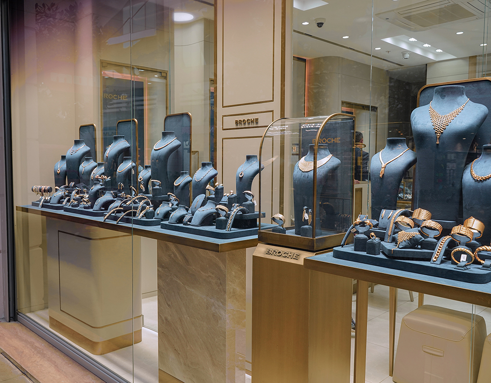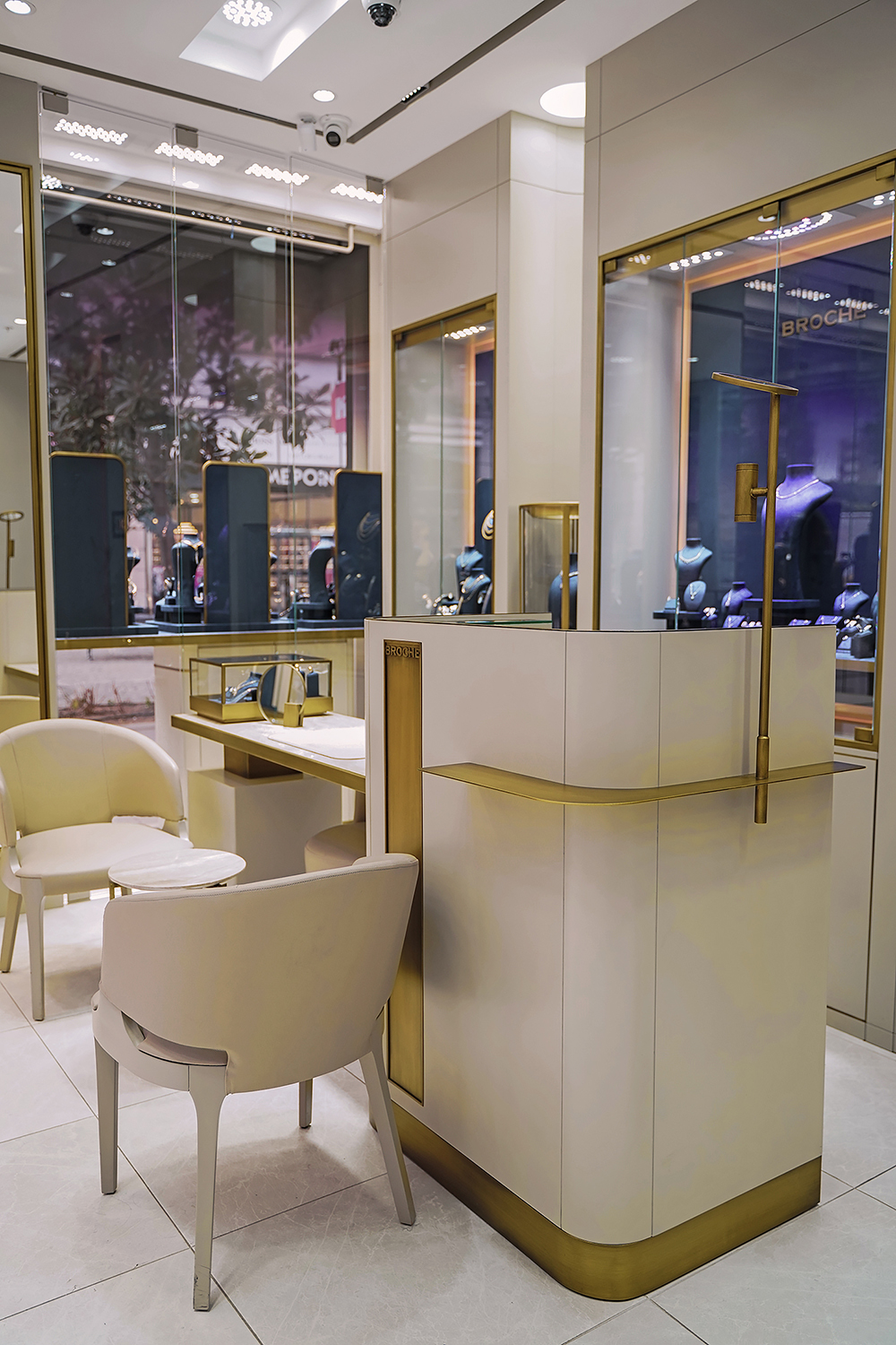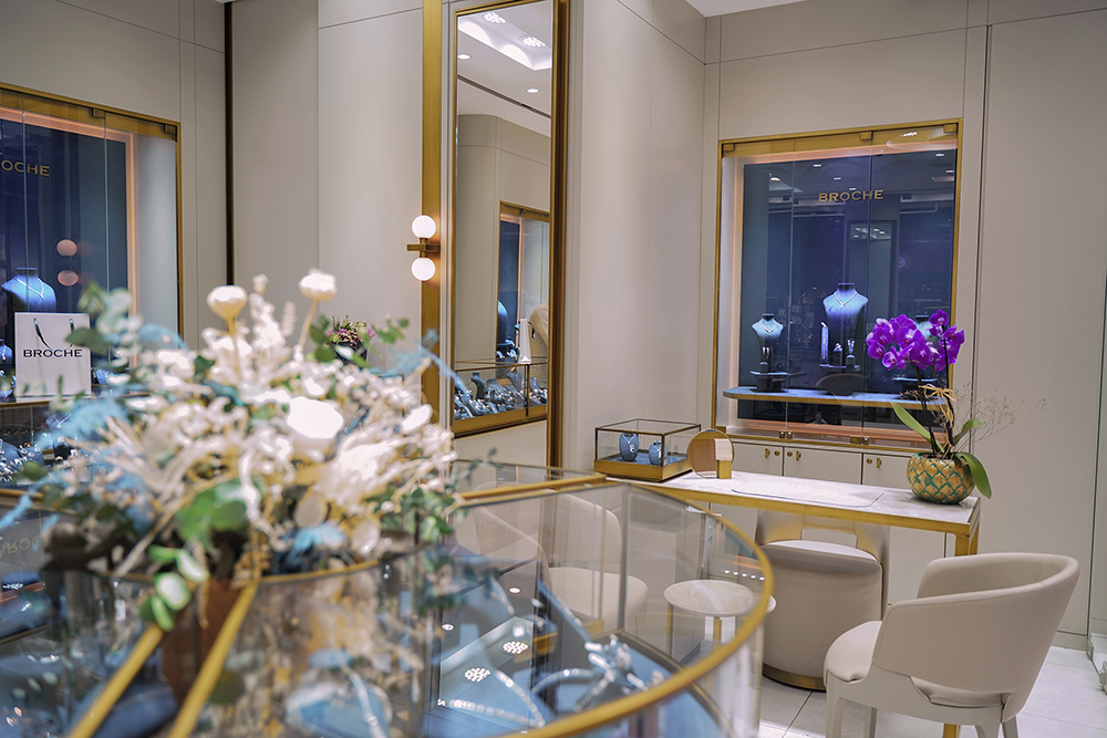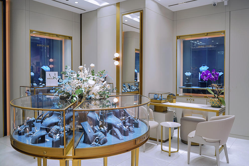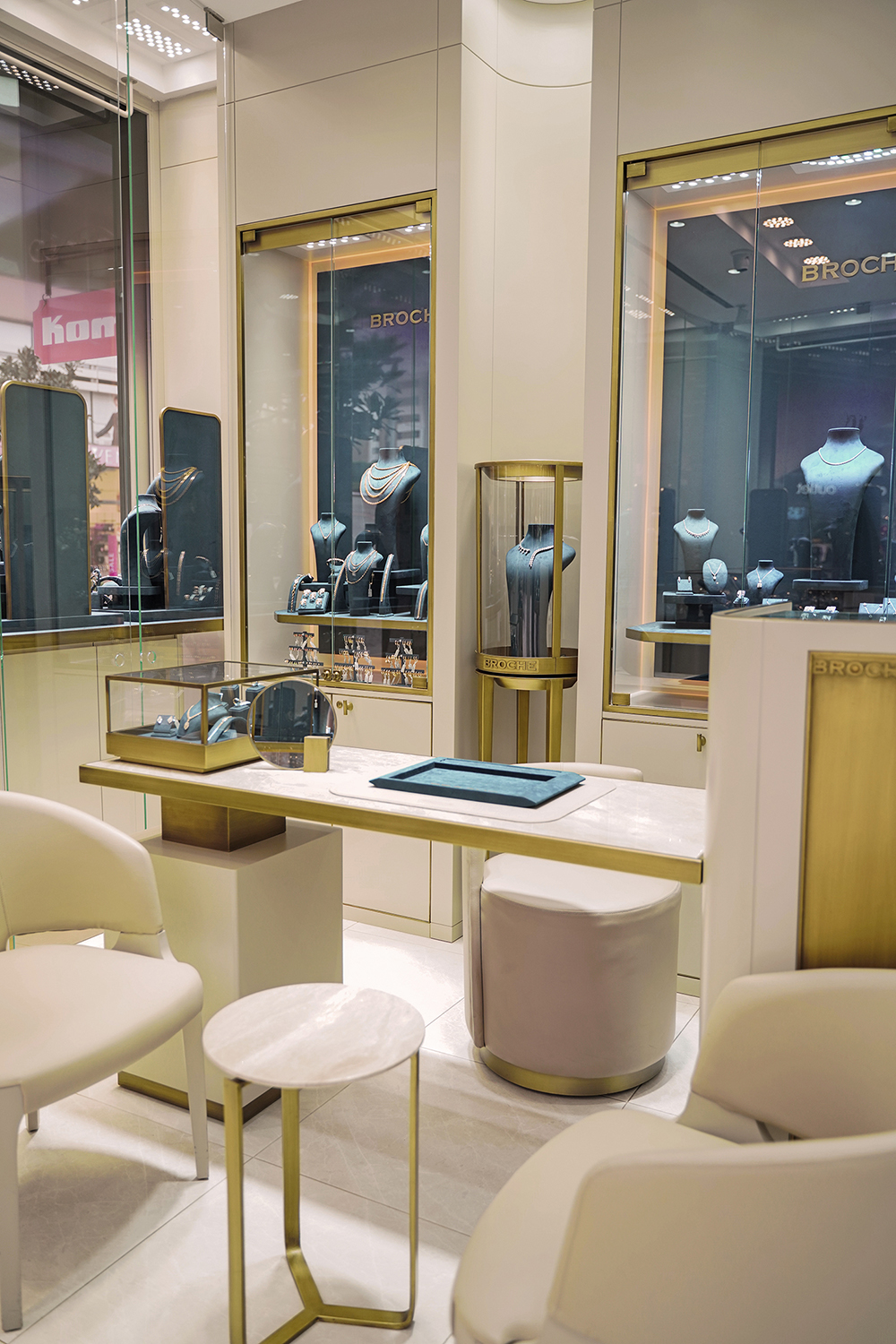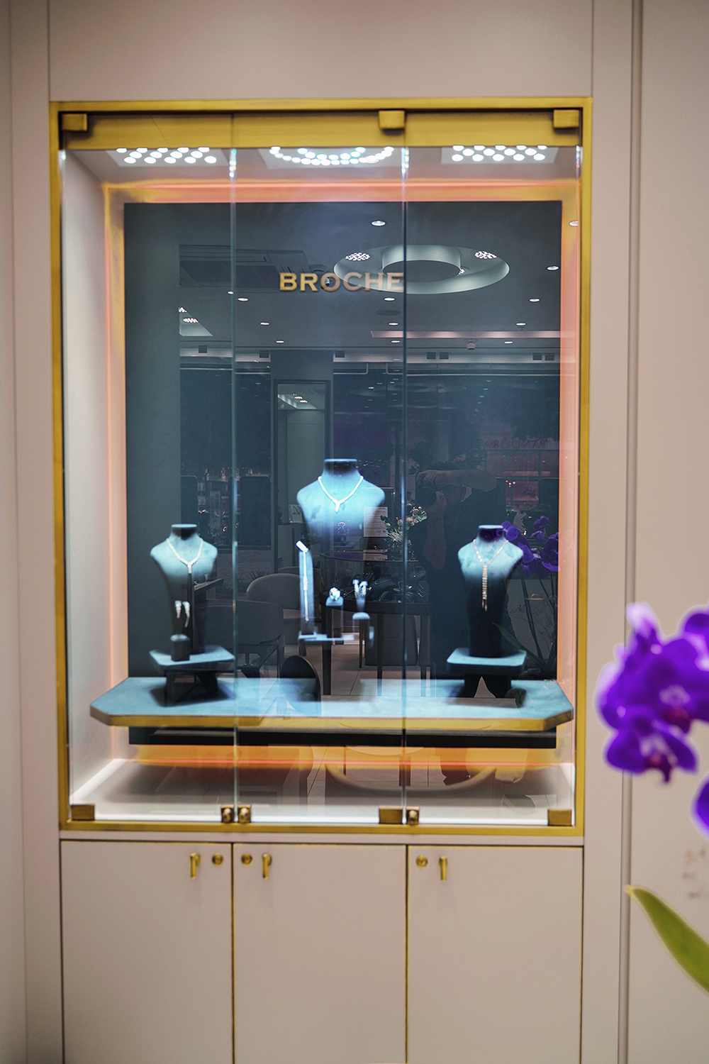 Lüks mücevher mağazasının dekorasyonunda konsept renklerinin uyumuna özen gösterildi. Duvar ünitelerinde mavi tonlar kullanıldı. Metal malzemelerde antik eskitme tercih edildi. Zeminde ise vizon tonlarında mermer desenli seramiğe yer verildi.