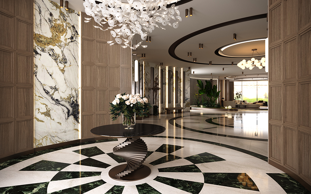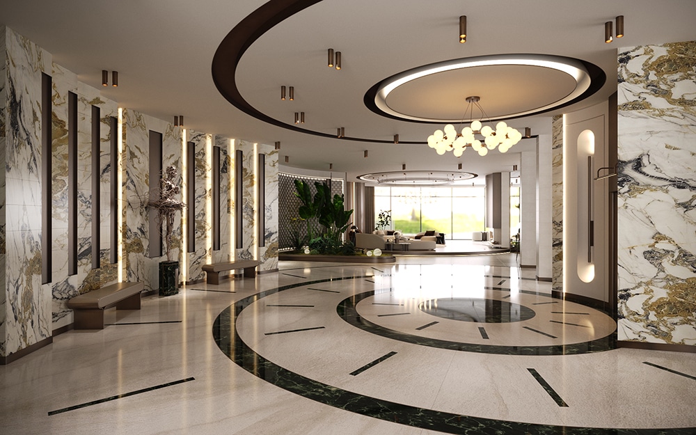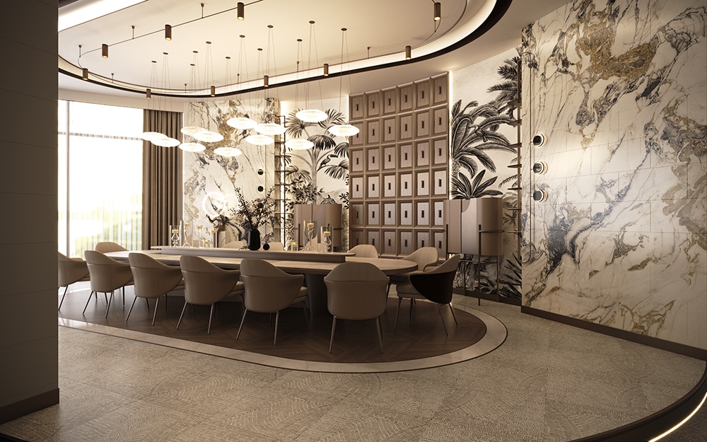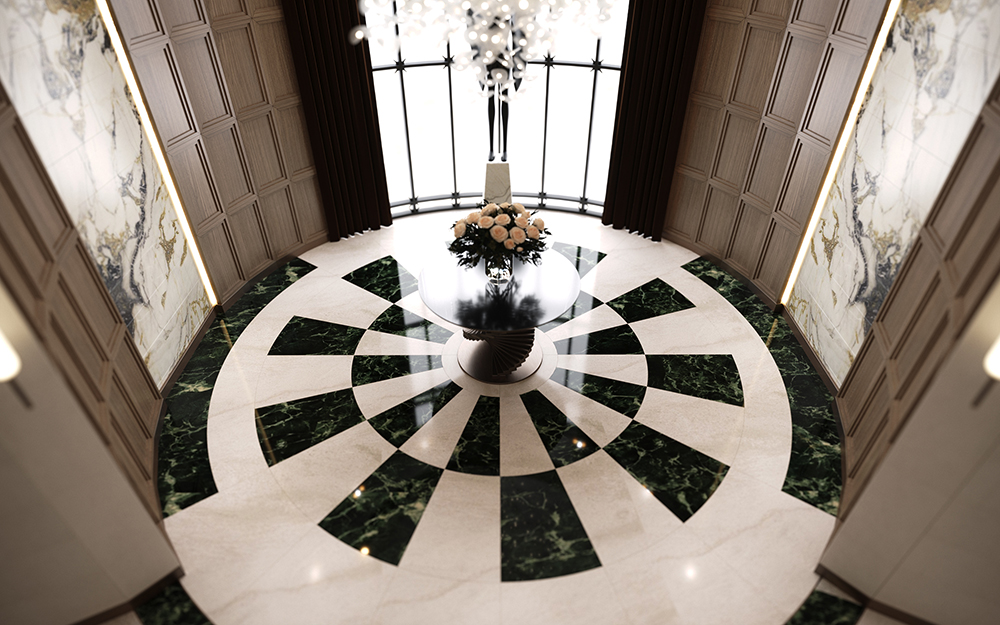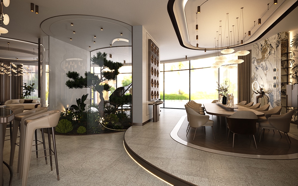 Tavanda ve zeminde malzeme ve kot farkı kullanılarak konutun tasarımında dinamik bir aura sağlandı. Evin tasarımda mermer, ahşap gibi doğal malzemeler kullanıldı. Ayrıca biyofilik tasarım çizgisi ile yeşilin huzuru yaşam alanının her köşesinde sergilendi.