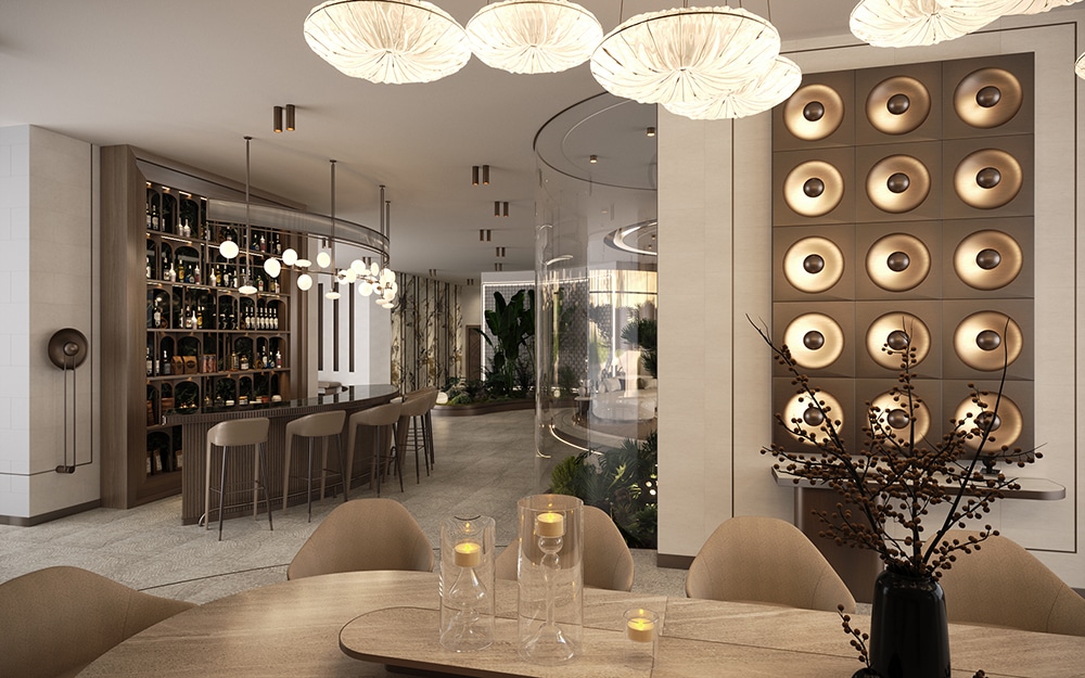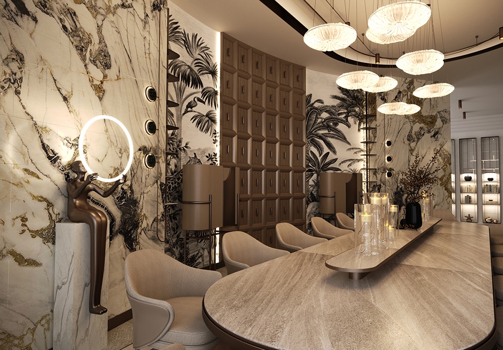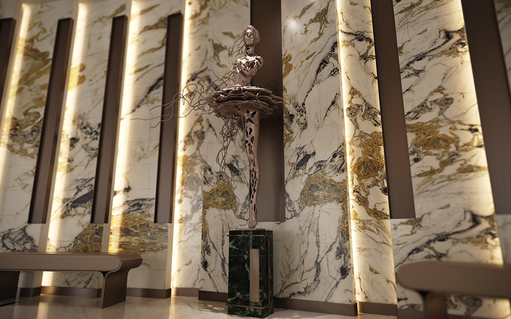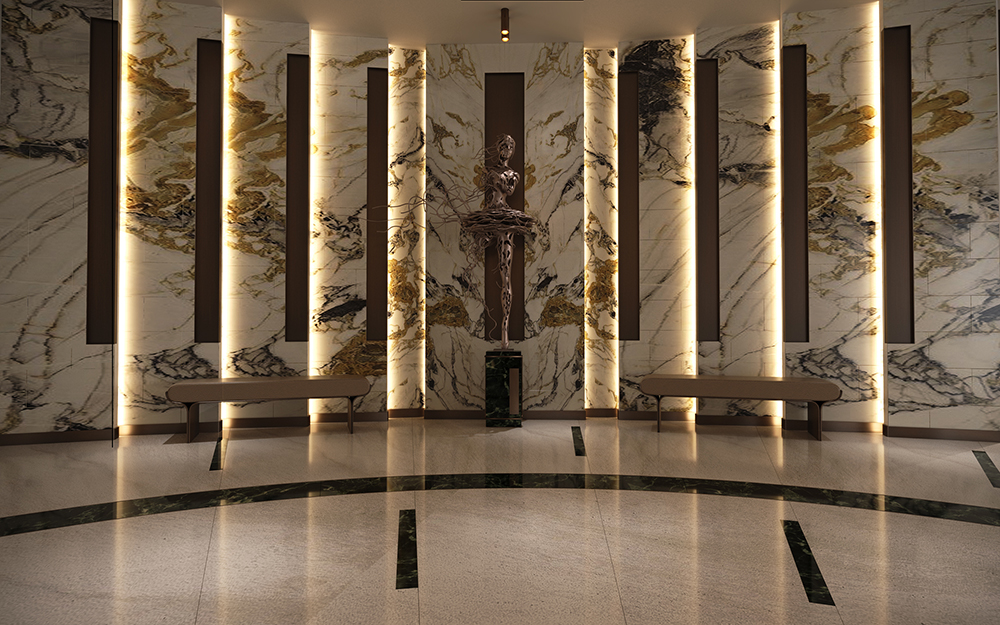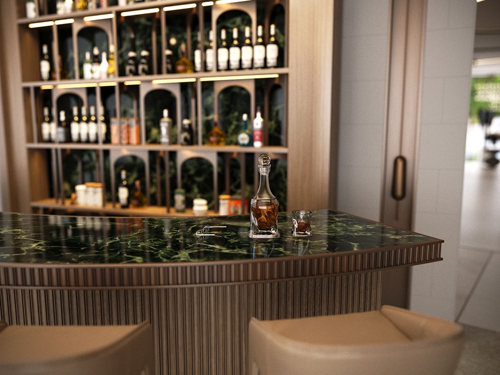 Tavanda ve zeminde malzeme ve kot farkı kullanılarak konutun tasarımında dinamik bir aura sağlandı. Evin tasarımda mermer, ahşap gibi doğal malzemeler kullanıldı. Ayrıca biyofilik tasarım çizgisi ile yeşilin huzuru yaşam alanının her köşesinde sergilendi.