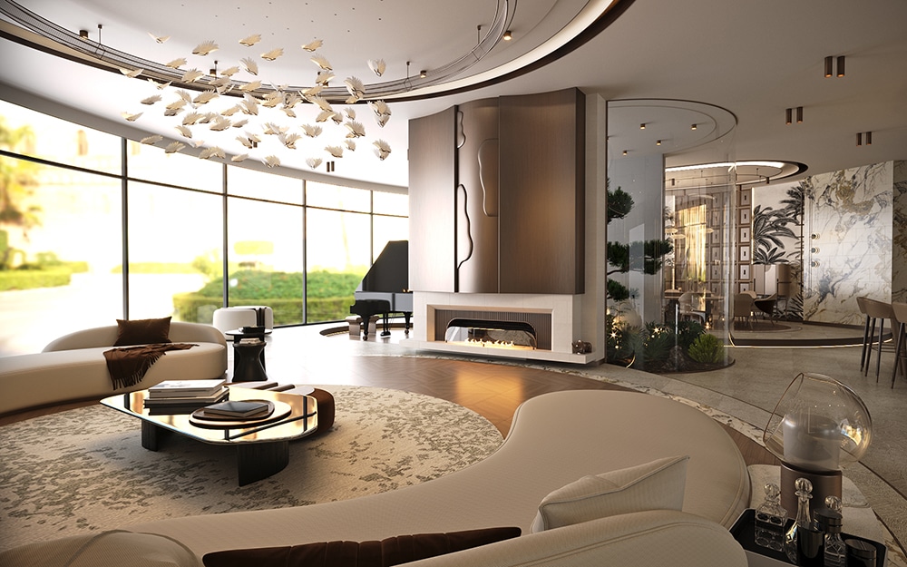 Yerleşim olarak şömine, iç bahçe ile evin merkezine konumlandırıldı. İç bahçe; yemek alanı, bar ve piyano köşesini separe etmede kullanıldı.