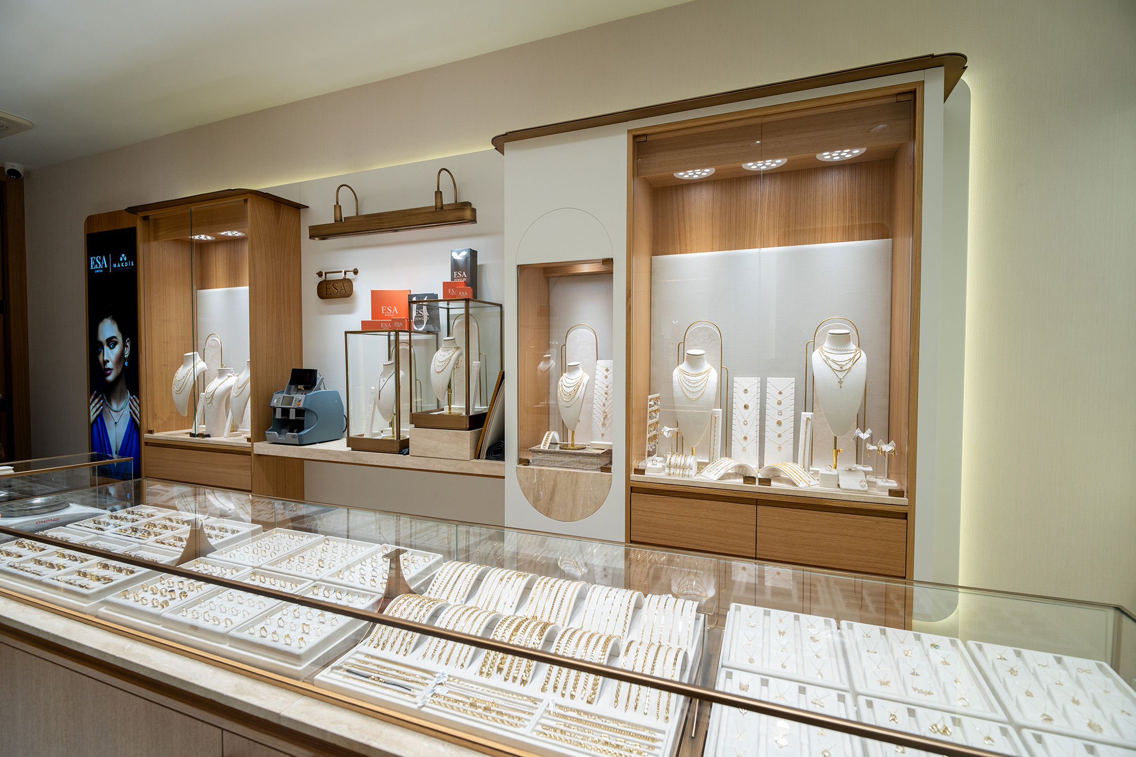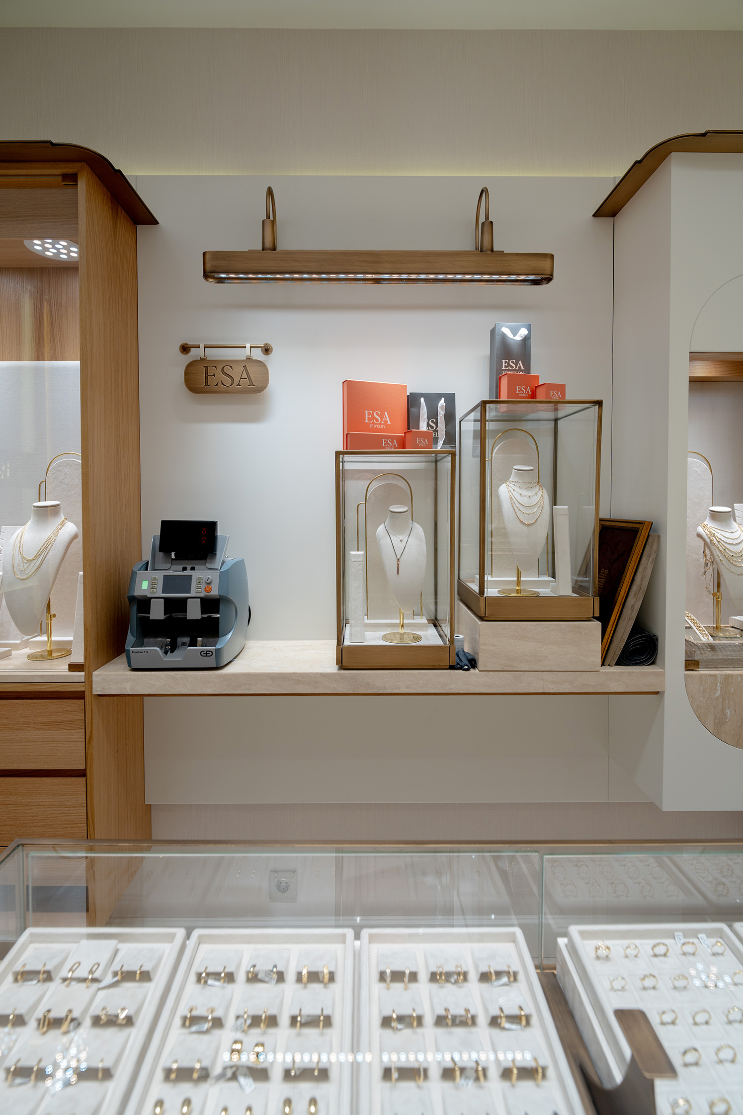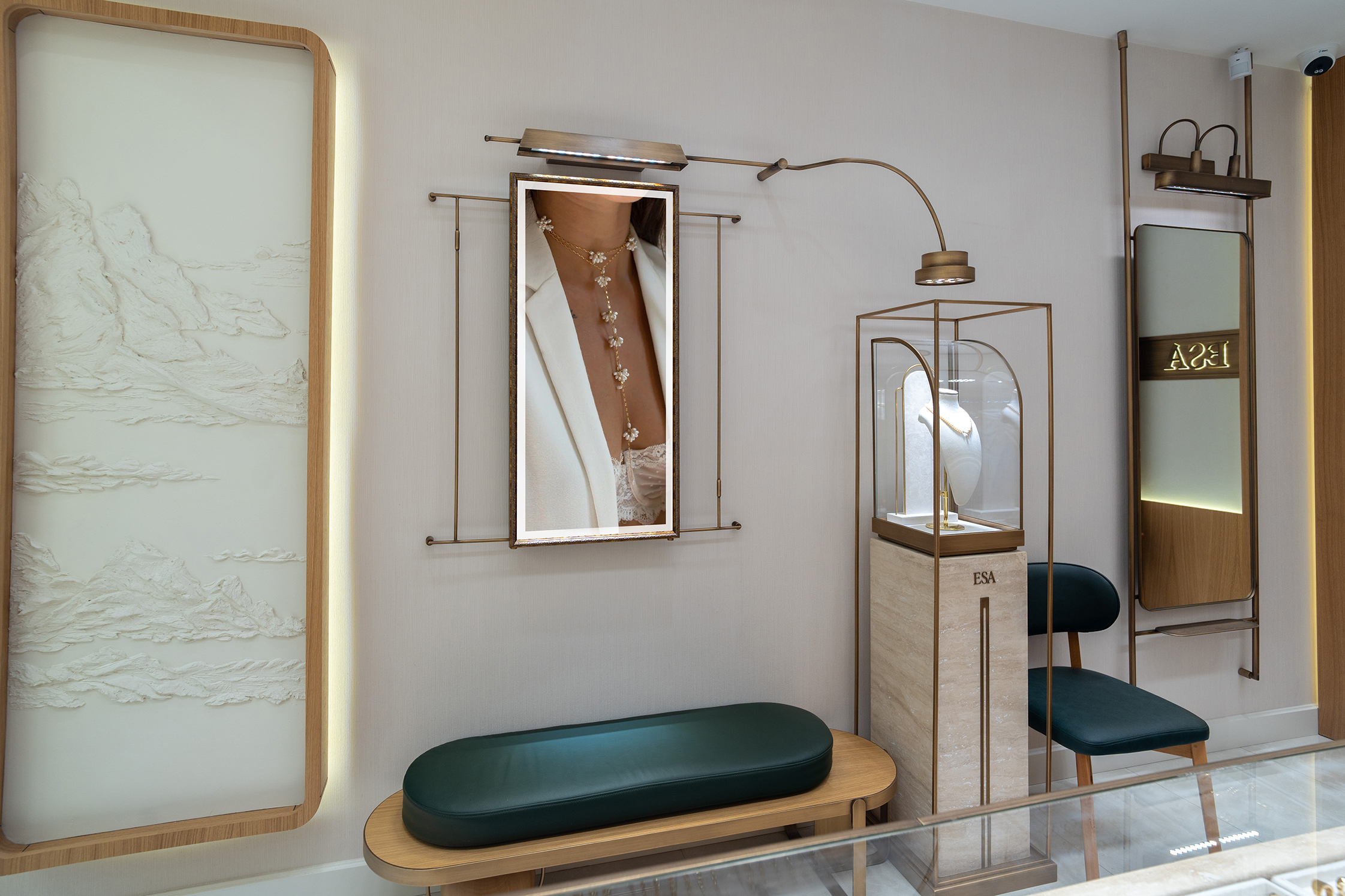 İç mekânda yer alan özel sergileme alanları ve zarif totemler, sunulan ürünleri adeta birer sanat eseri gibi öne çıkarıyor. Bu sergileme üniteleri, sadece estetik birer obje olmakla kalmayıp, aynı zamanda fonksiyonel depolama çözümleri de sunuyor. Duvarlarda kullanılan özel dokulu kaplamalar, mekana derinlik ve zarafet katarken, marka kimliğini yansıtan katmanlı uygulamalar da mekanın özgün karakterini güçlendiriyor.
