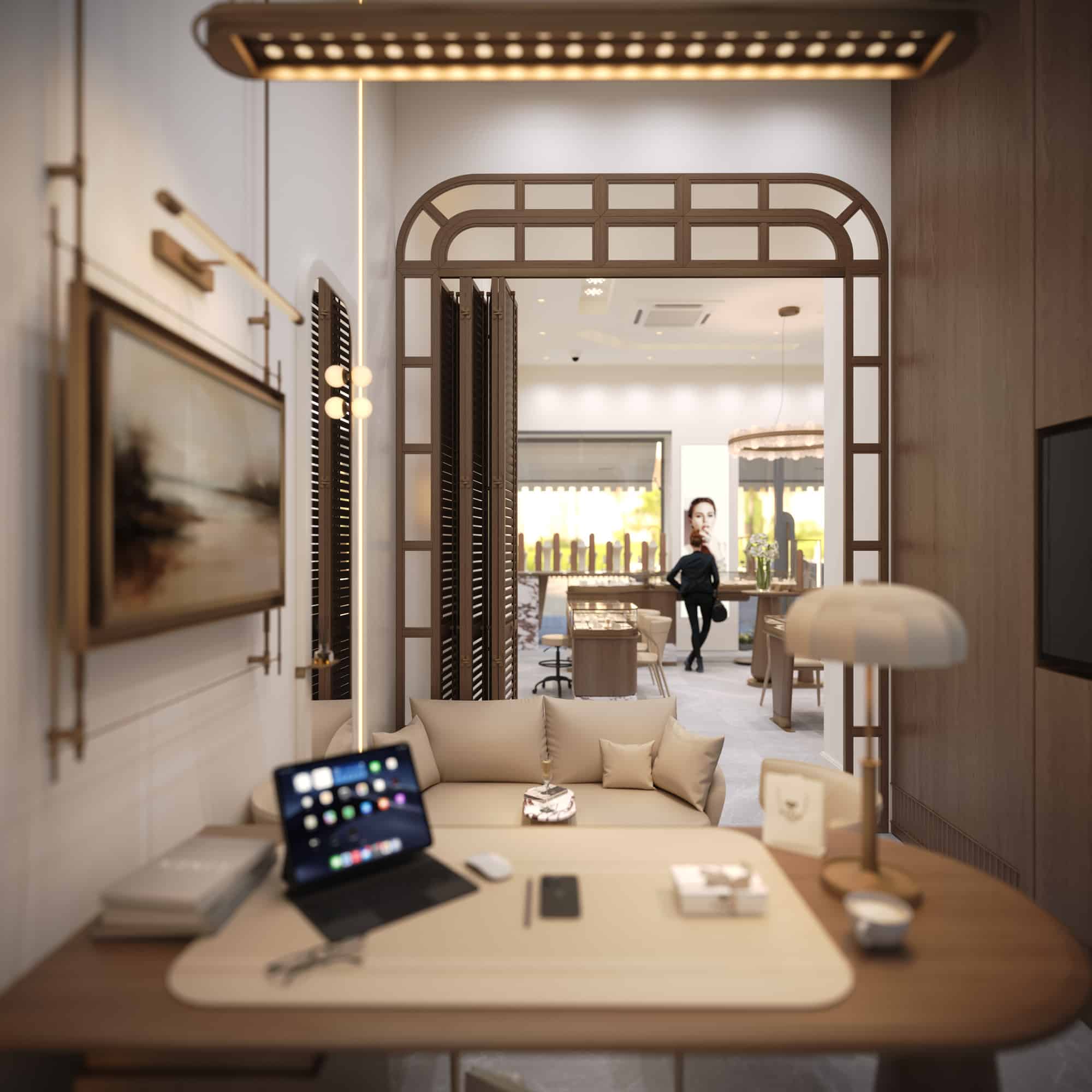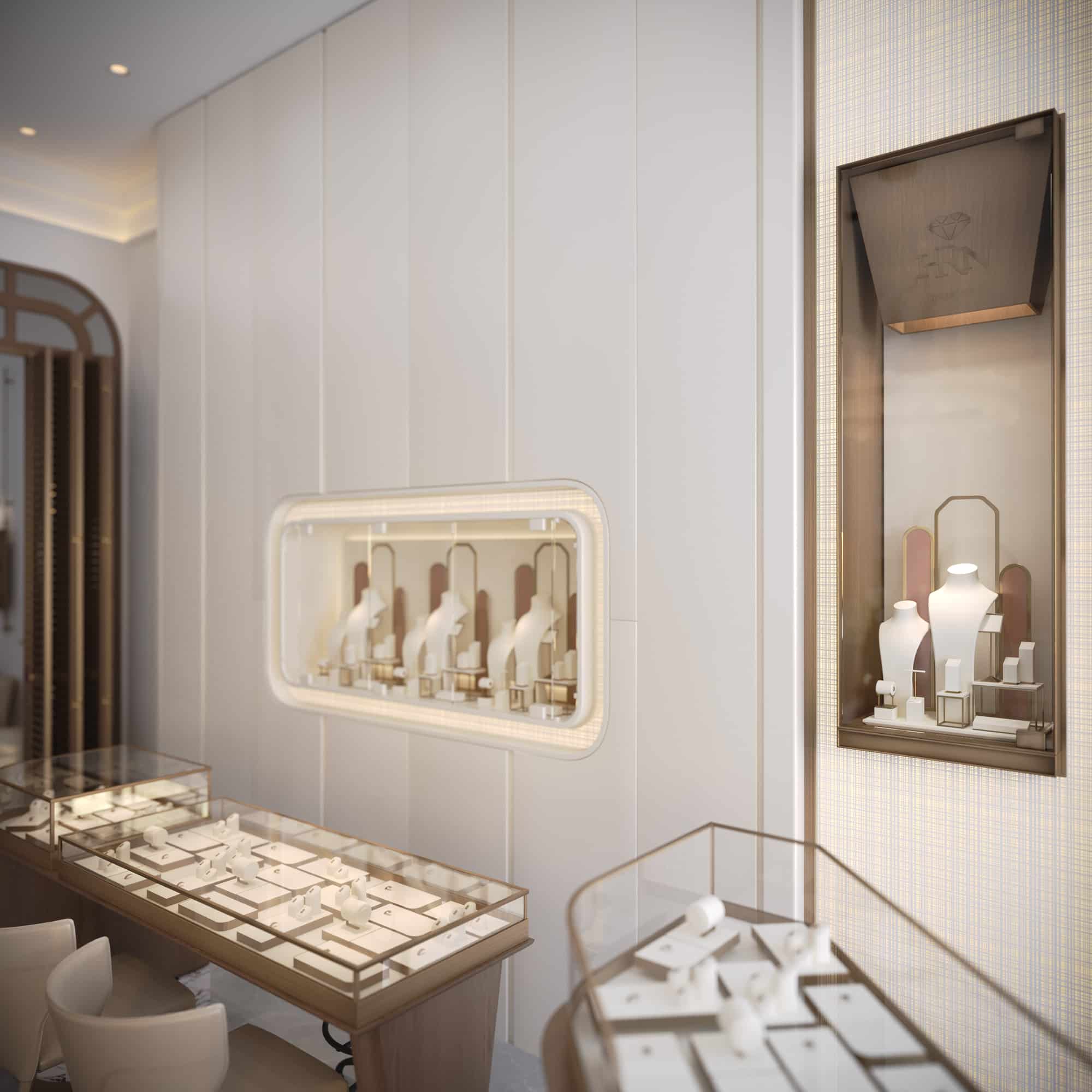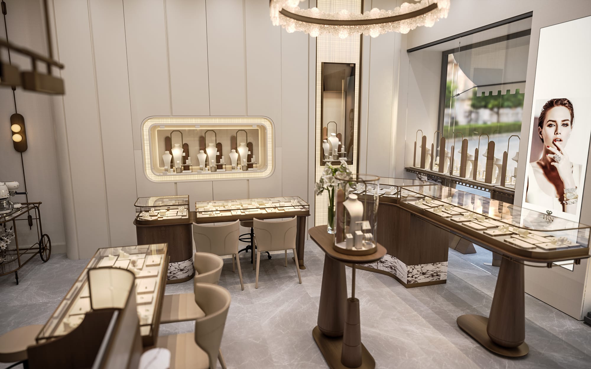 Mağaza içinde yer alan özel tasarım pırlanta sergileme alanları ve zarif totemler, her bir mücevheri adeta bir sanat eseri gibi öne çıkarıyor. Sergileme üniteleri, yalnızca estetik değil aynı zamanda fonksiyonel çözümler sunarak depolama ihtiyaçlarını da karşılıyor.
