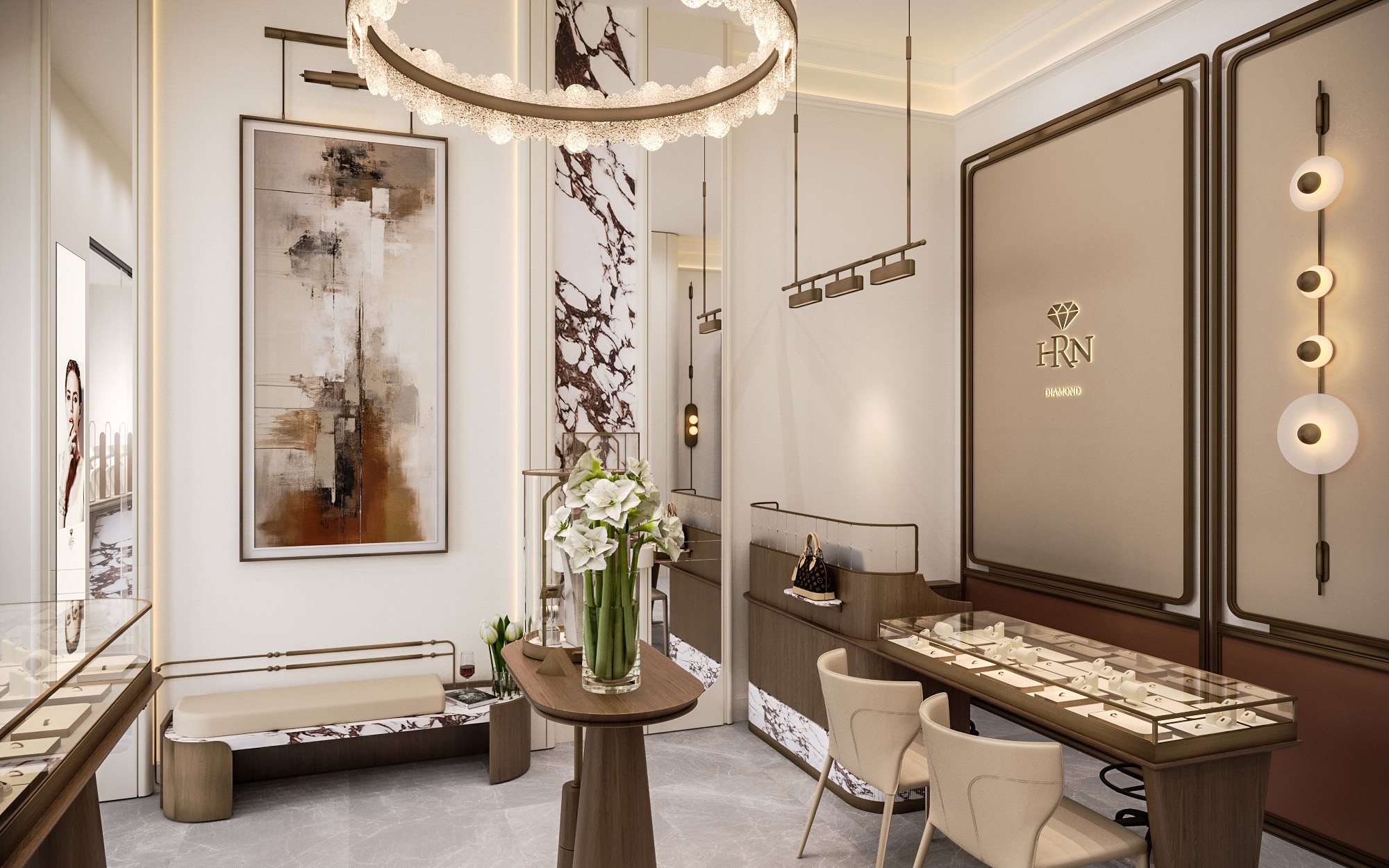 İç mekânda kullanılan mermer, ahşap detaylar ve eskitme metal yüzeyler, sofistike bir atmosfer yaratırken; niş içlerinde tercih edilen özel dokulu duvar kaplamaları mekâna derinlik ve zarafet katıyor. Marka duvarında yapılan katmanlı uygulama ise HRN Diamond’un özgün kimliğini güçlü bir biçimde yansıtıyor.
