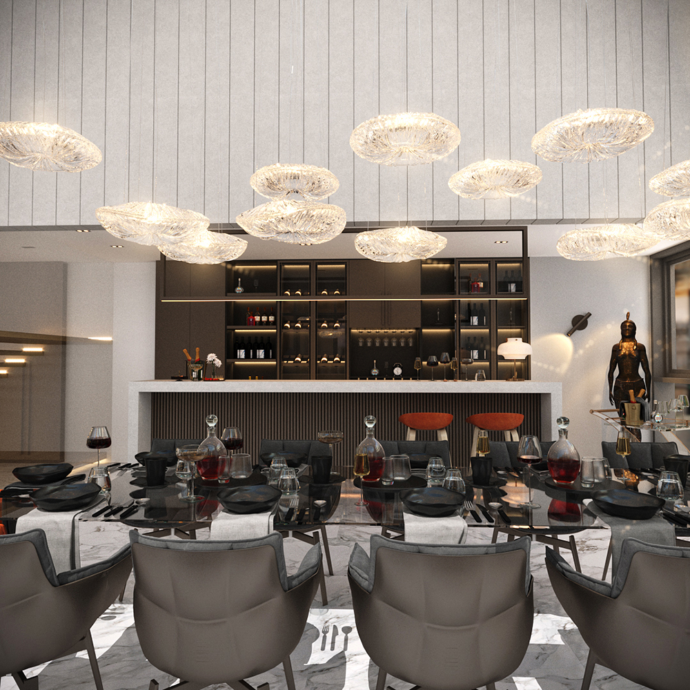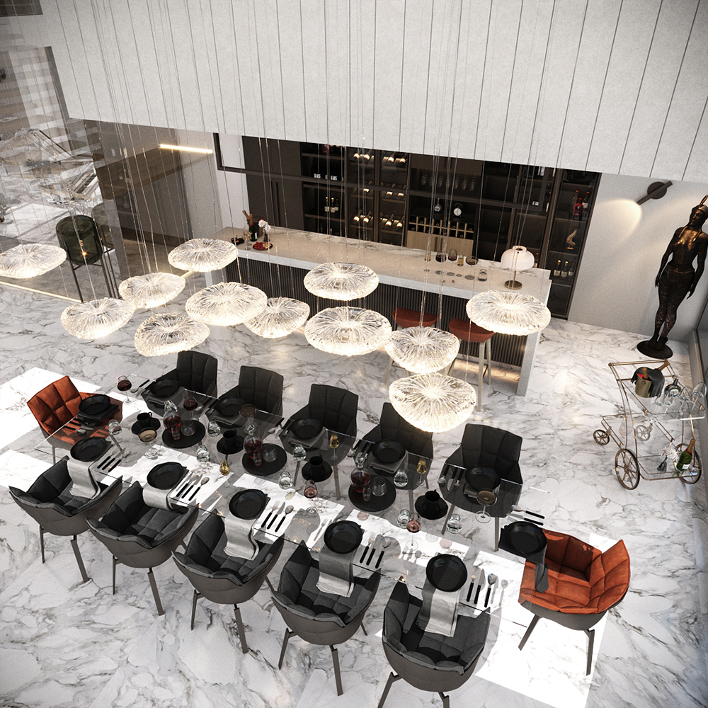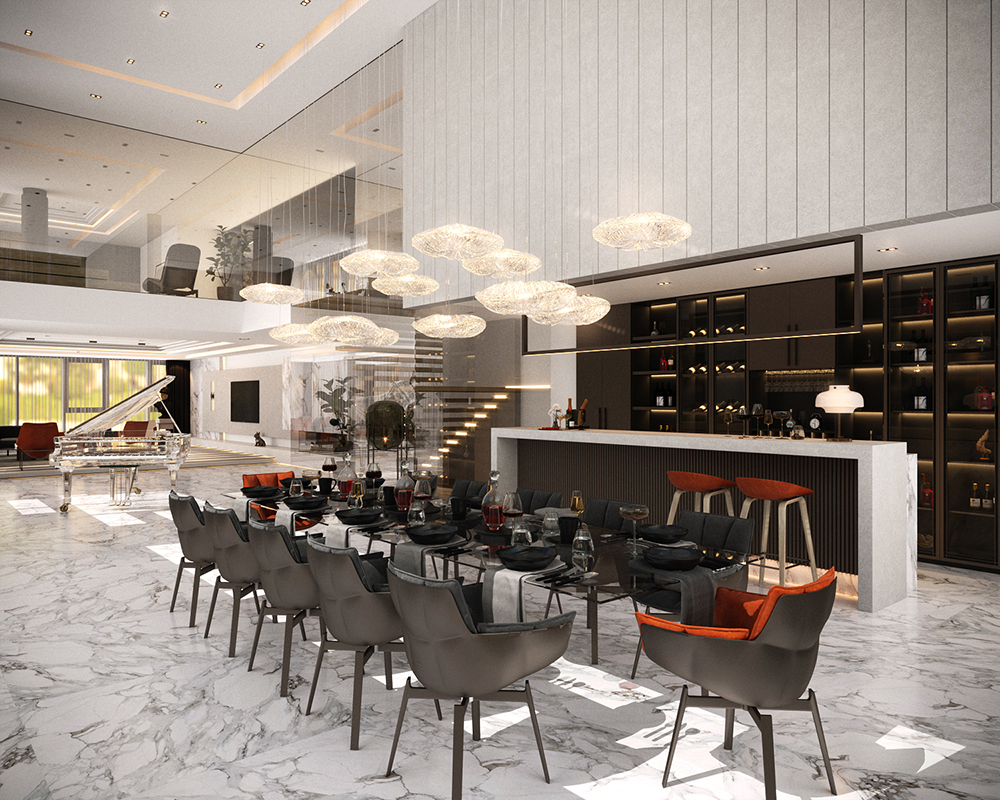 Konut tasarımında yemek salonunda antrasit lake malzemelerle tasarlanan dolaplı bar bölümüne cam yemek masası ve özel aydınlatmalar eşlik etmektedir.