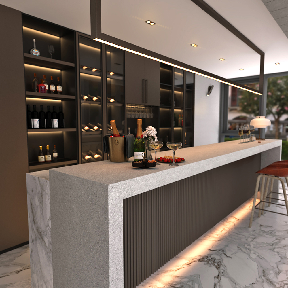 Zeminde ve detaylarda doğal mermer tercih edildi. Dolap içlerinde ve bar bölümünde led aydınlatmalar kullanarak tasarım zenginleştirildi.