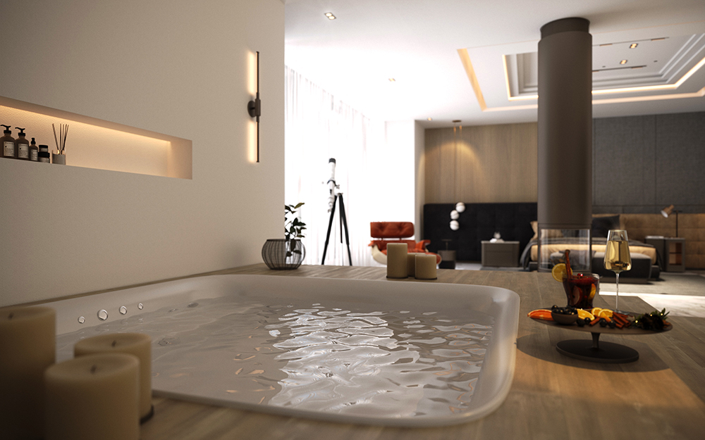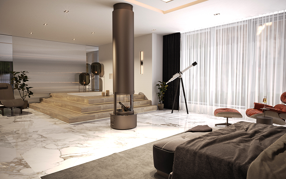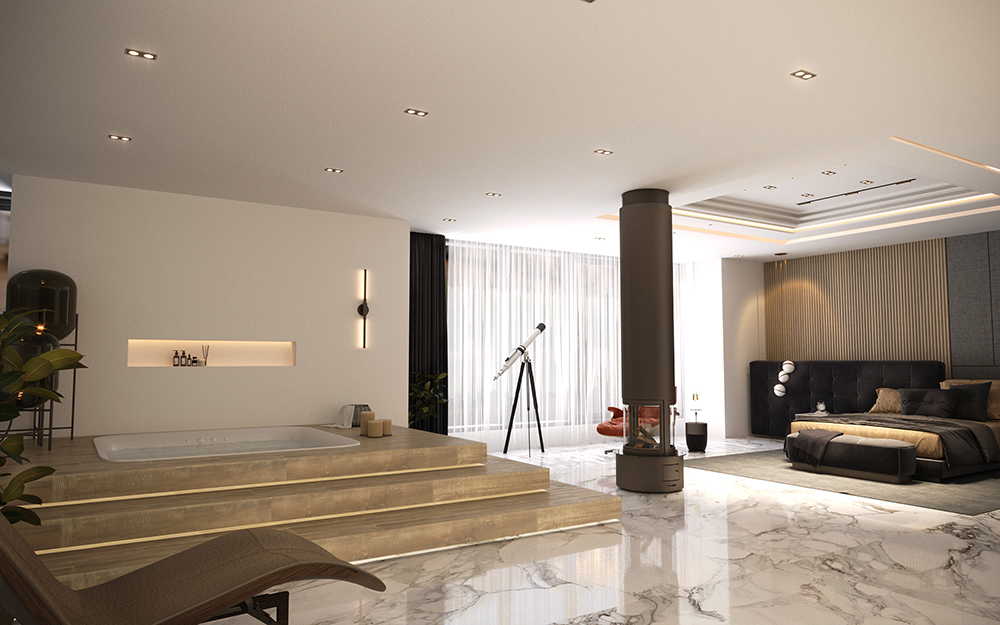 Yatak odası için kademeli bir küvet tasarlandı. Oda için özel tasarlanmış olan şömine de ortama farklı bir aura kazandırdı. Zeminde mermer, ahşap, halı kombinasyonu ile; duvarlar da ise ahşap detaylarla bu aura zenginleştirildi.