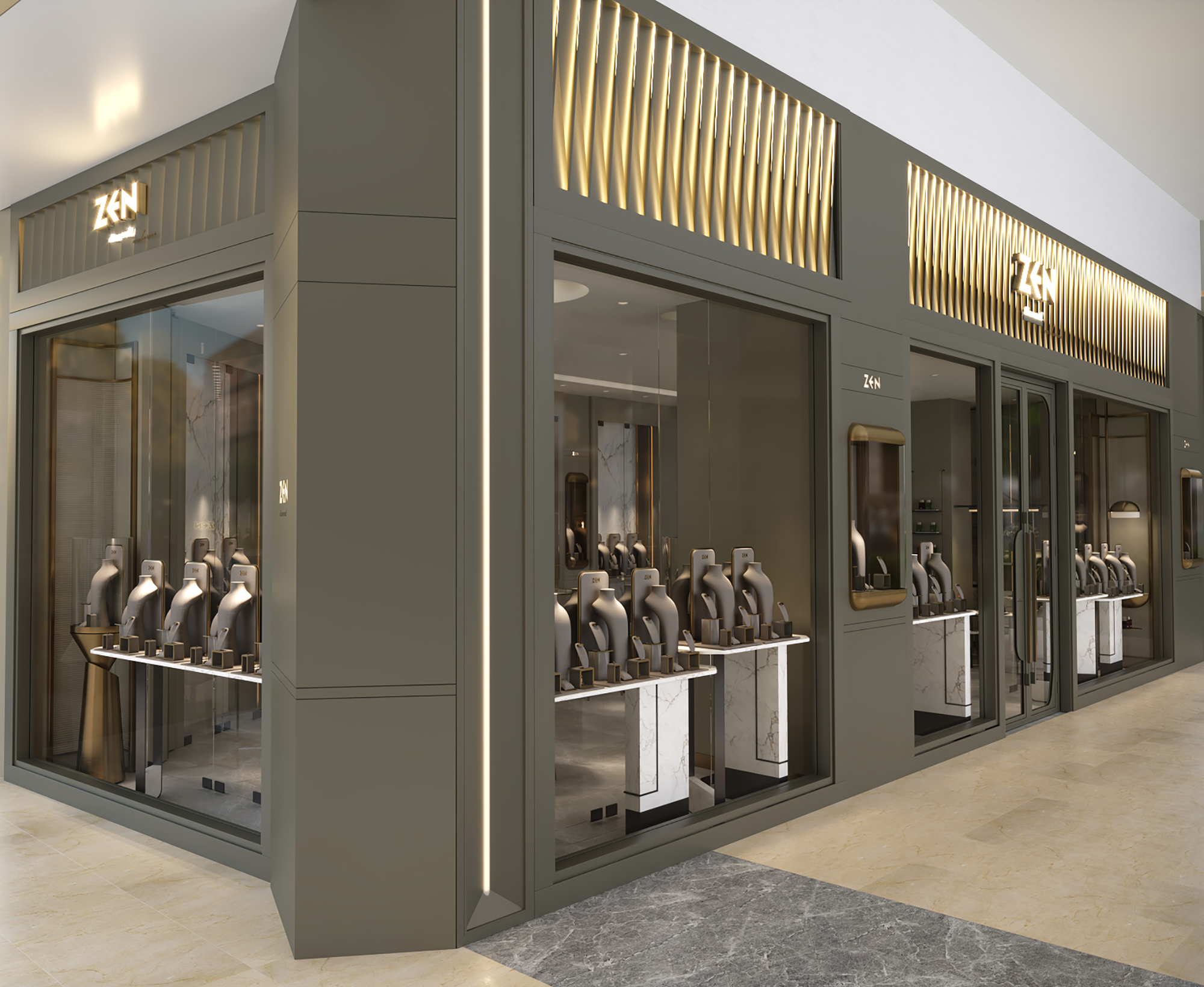 Zen Mağazası konsepti, modern lüks kimliğini cepheden iç mekana kadar tutarlı bir mimari dil ile sergilemektedir. Dış cephede kullanılan koyu greige tonu ve üst kısımdaki dalgalı, üç boyutlu paneller, zarif aydınlatma ile birleşerek davetkar bir odak noktası oluşturur.