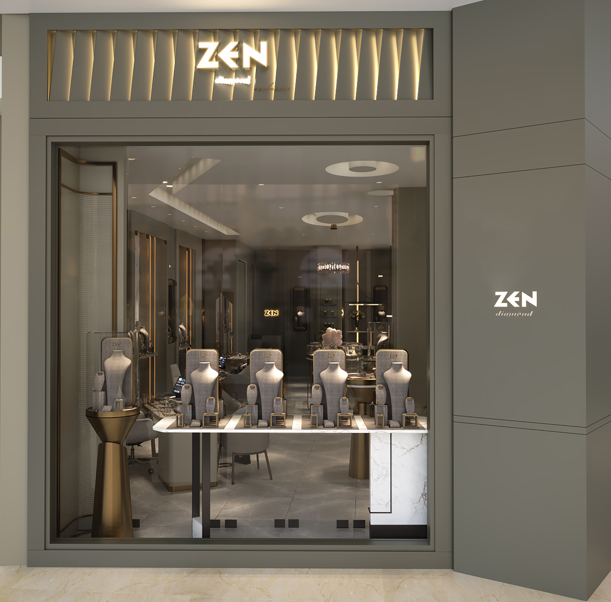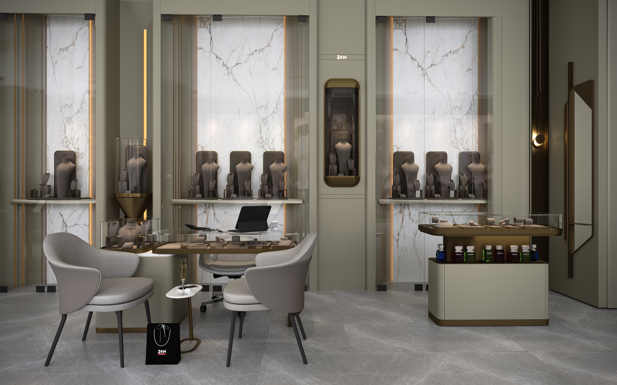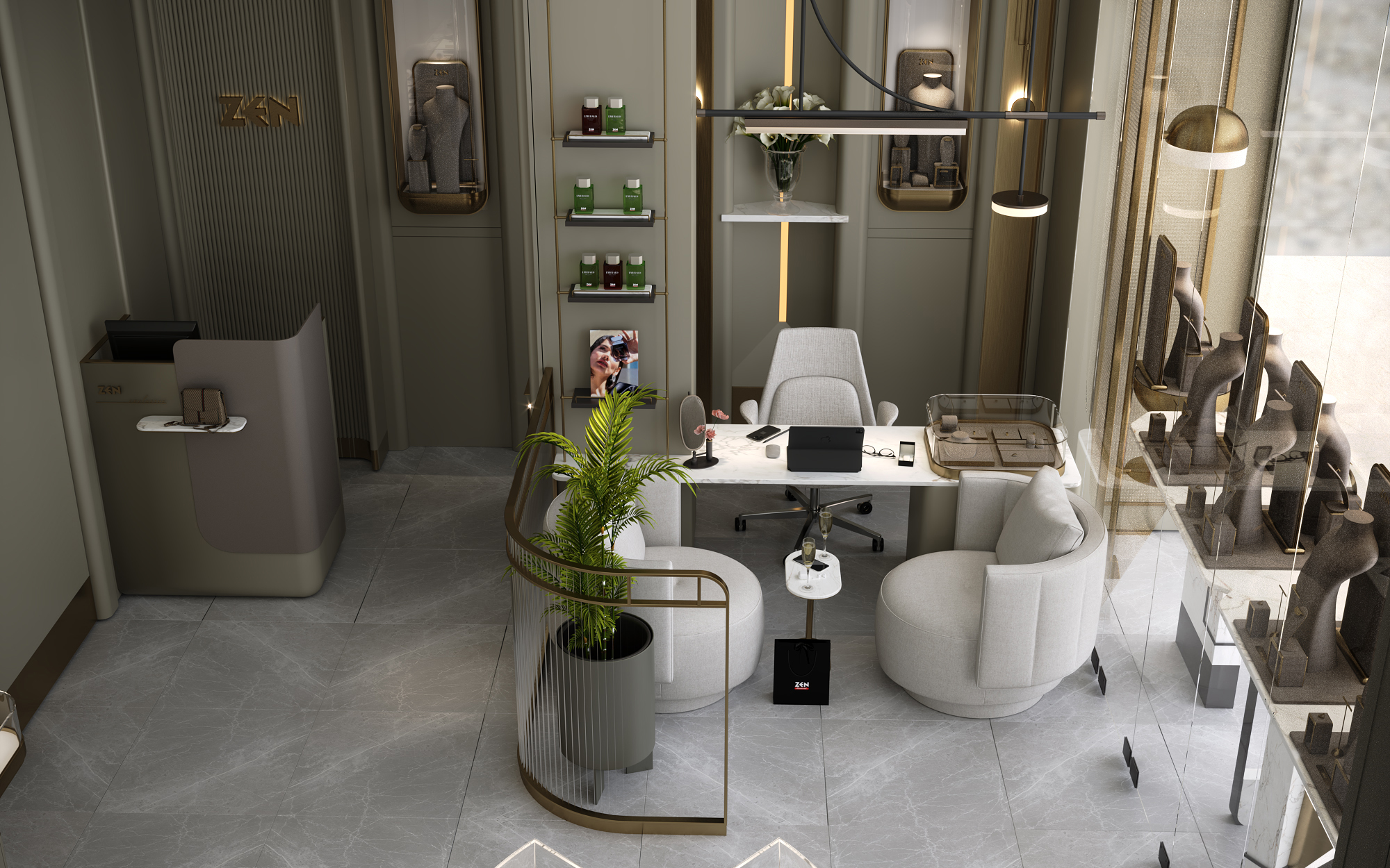 İç mekanda tasarım; sıcak nötr tonlar, gri damarlı seramik ve pirinç metalik aksanlarla zenginleştirilmiştir. Mekanın merkezi, oval formlu, pirinç sergileme vitrini ile tanımlanır. Tavanı süsleyen beşgen formlu, kristal detaylı modern avize heykelsi bir etki yaratırken, duvarlara entegre edilen oval çerçeveli sergileme nişleri markanın görsel dilini pekiştirir. Satış masaları,sergileme üniteleriyle beraber kişiselleştirilmiş bir danışmanlık deneyimine olanak tanır. Zen, yüksek malzeme kalitesini ve sofistike formları birleştirerek, bütüncül ve başarılı bir lüks perakende uygulaması sunmaktadır.