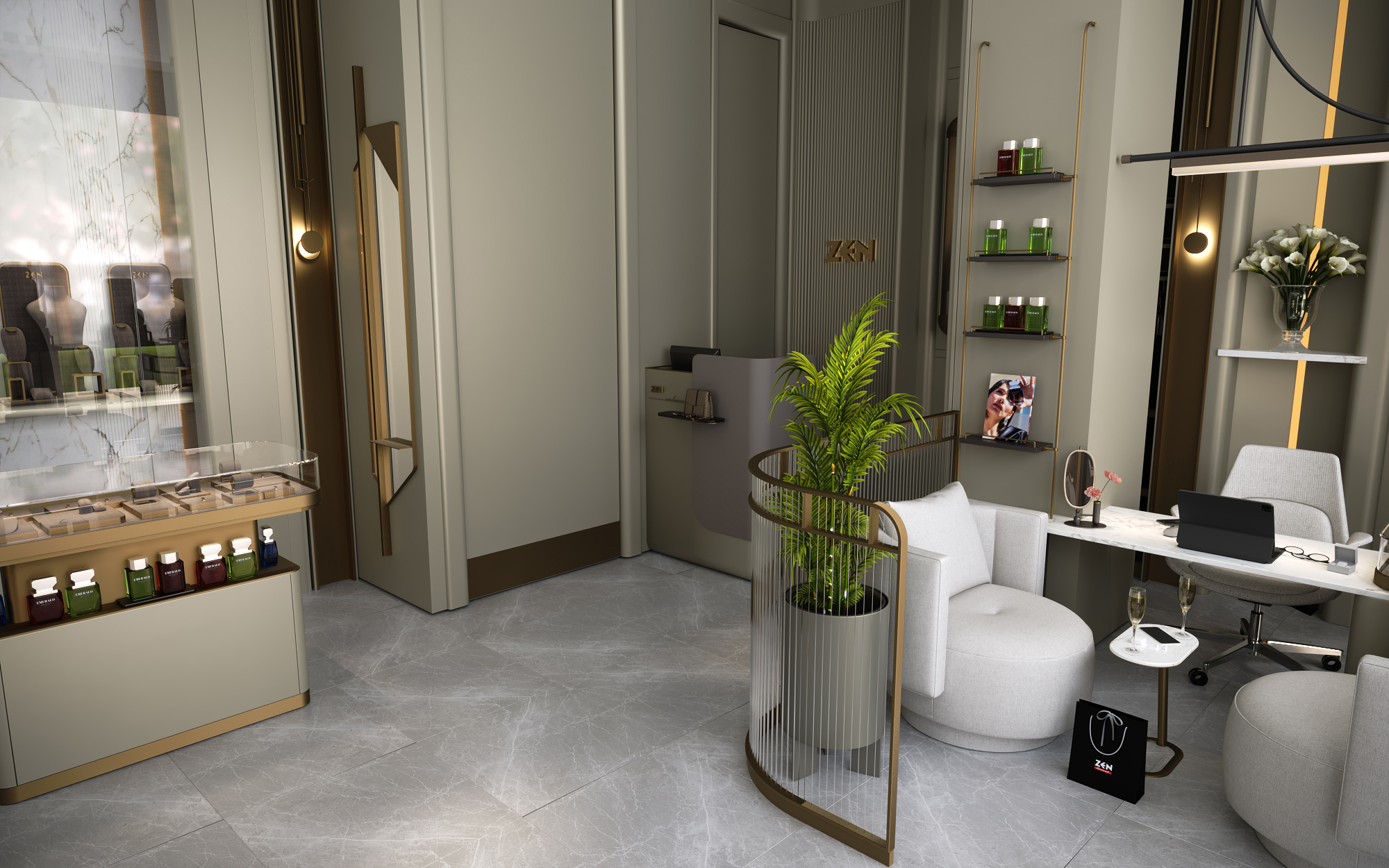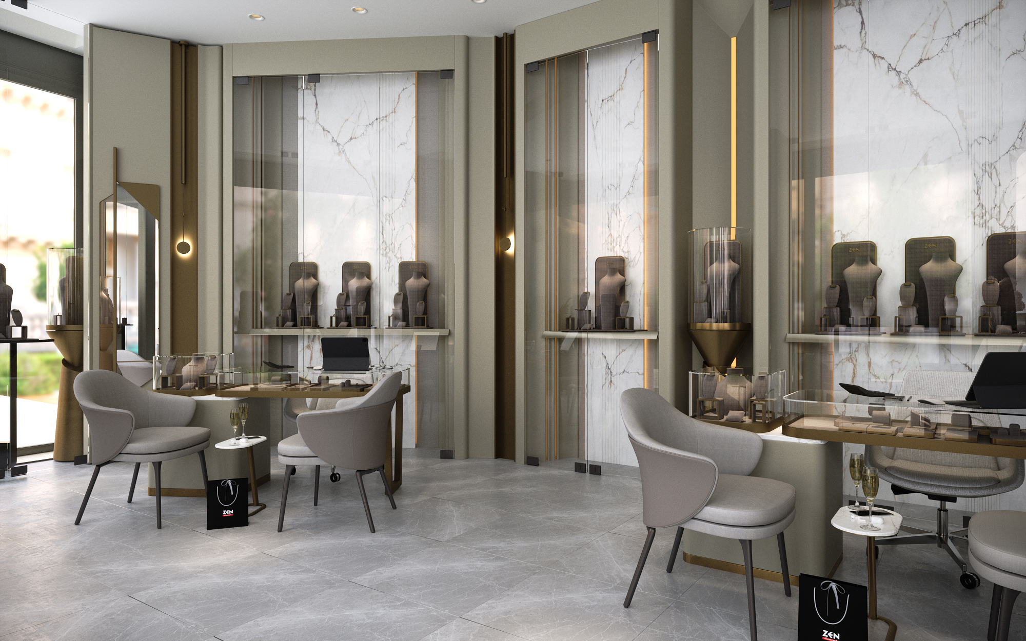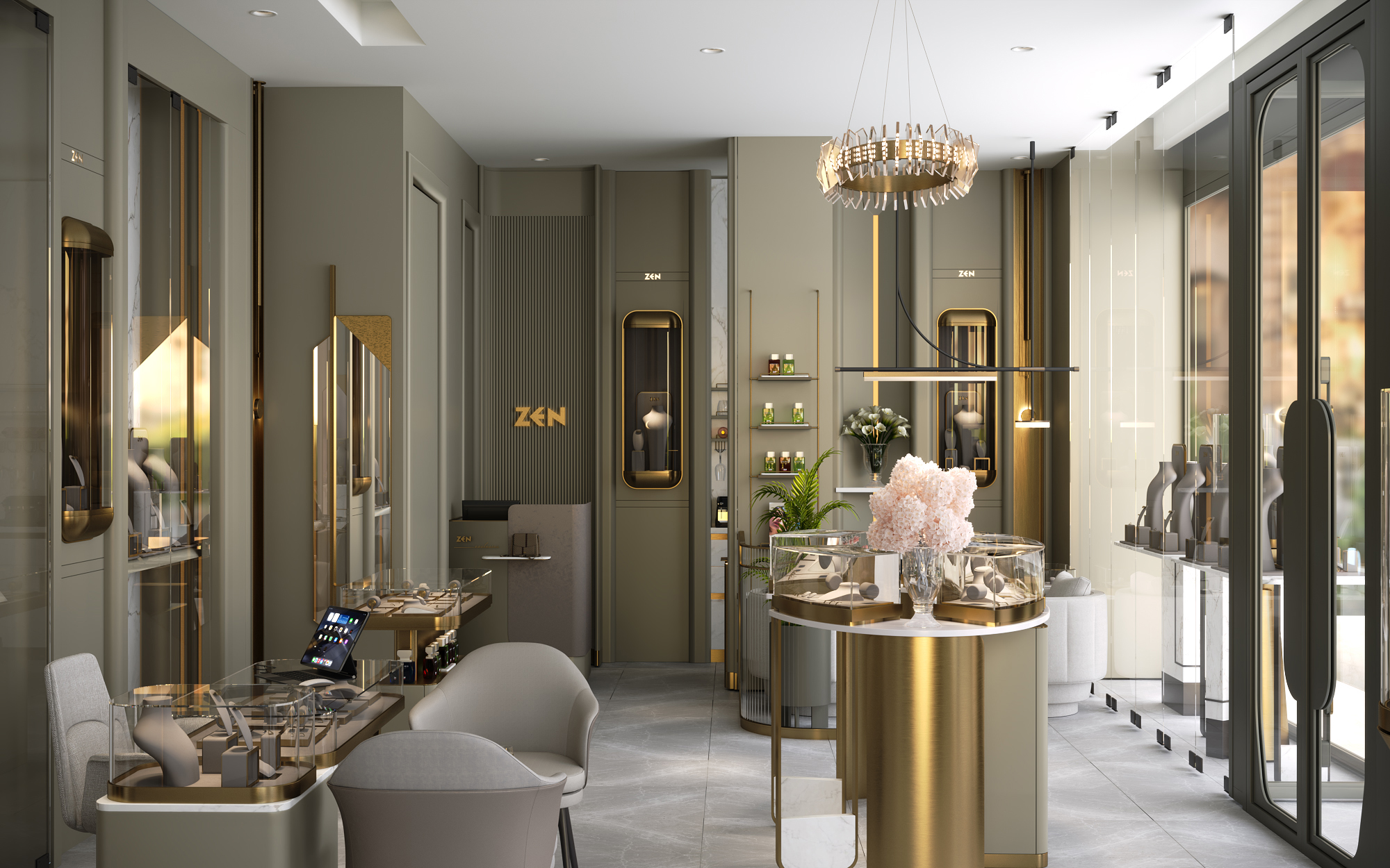 İç mekanda tasarım; sıcak nötr tonlar, gri damarlı seramik ve pirinç metalik aksanlarla zenginleştirilmiştir. Mekanın merkezi, oval formlu, pirinç sergileme vitrini ile tanımlanır. Tavanı süsleyen beşgen formlu, kristal detaylı modern avize heykelsi bir etki yaratırken, duvarlara entegre edilen oval çerçeveli sergileme nişleri markanın görsel dilini pekiştirir. Satış masaları,sergileme üniteleriyle beraber kişiselleştirilmiş bir danışmanlık deneyimine olanak tanır. Zen, yüksek malzeme kalitesini ve sofistike formları birleştirerek, bütüncül ve başarılı bir lüks perakende uygulaması sunmaktadır.